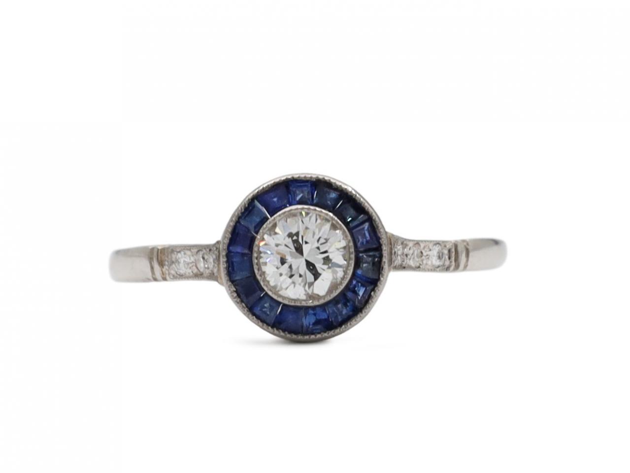 Art Deco style diamond and sapphire target ring in platinum. Centred with an estimated 0.25ct round brilliant cut diamond in a millegrain setting, encircled by a row of callibre cut sapphires in channel settings, to a stylish target ring featuring millegrain borders, pierced gallery and flanked to either side with raised diamond set shoulders which terminate to a solid shank.