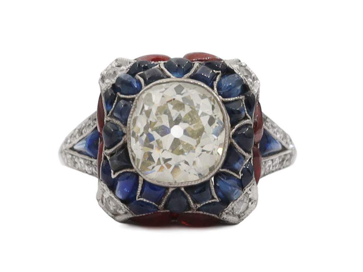 Art Deco style diamond sapphire and ruby cluster ring in platinum. Centred with an estimated 1.50ct cushion shape Old Mine cut diamond in a platinum millegrain setting, surrounded by cabochon cut sapphires in millegrain settings, bordered by eight fancy shape cabochon cut rubies in millegrain settings and highlighted throughout with round eight cut diamonds in grain and millegrain settings, to a stylish domed square cluster design with smooth settings, intricate gallery and flanked to either side with trumpeting sapphire and diamond set shoulders which curve and terminate to a solid shank.