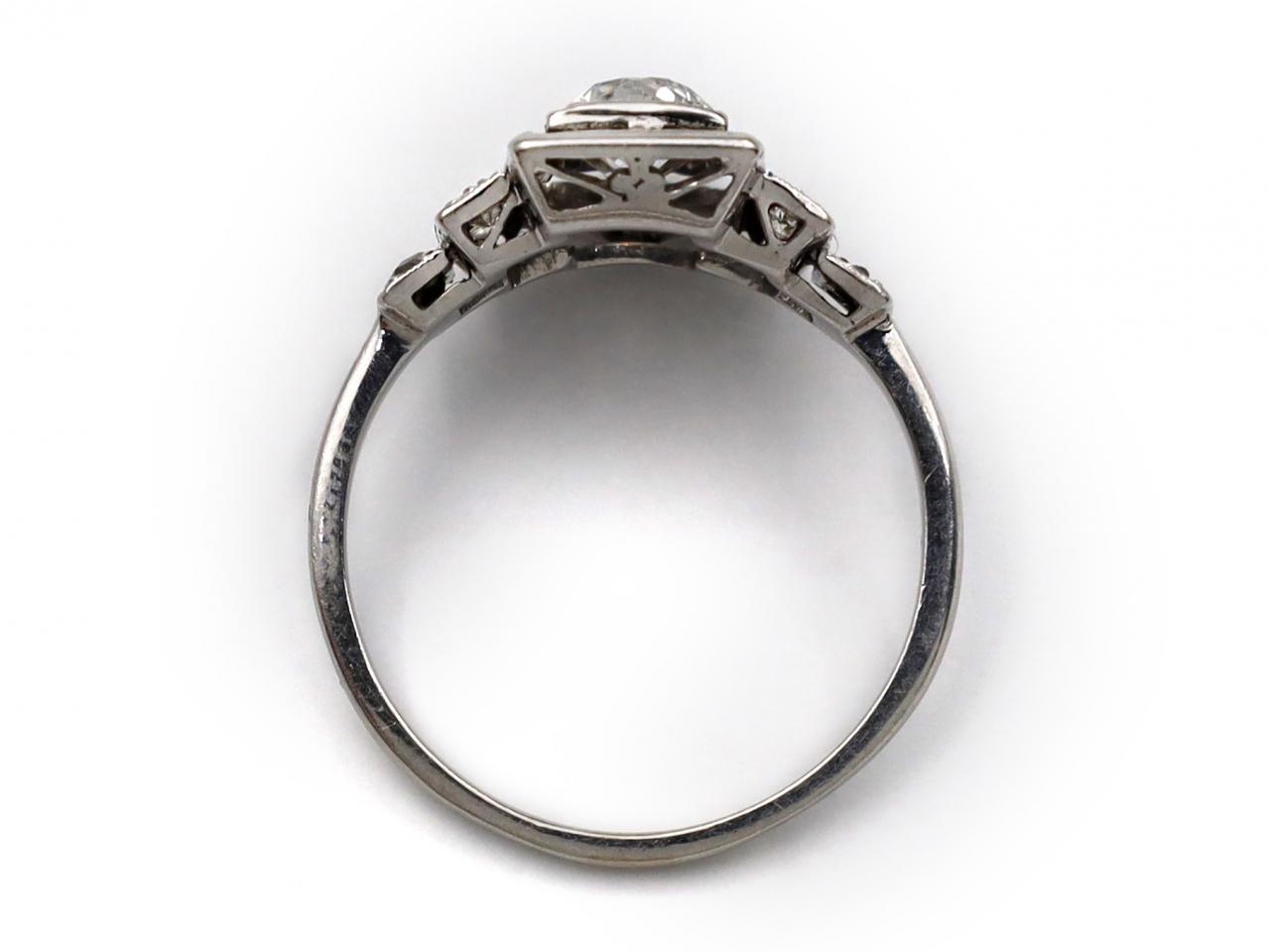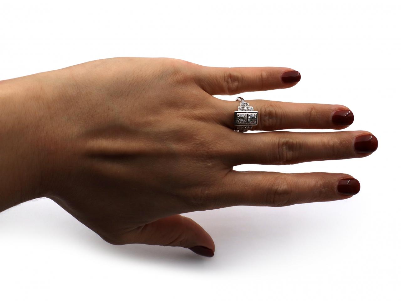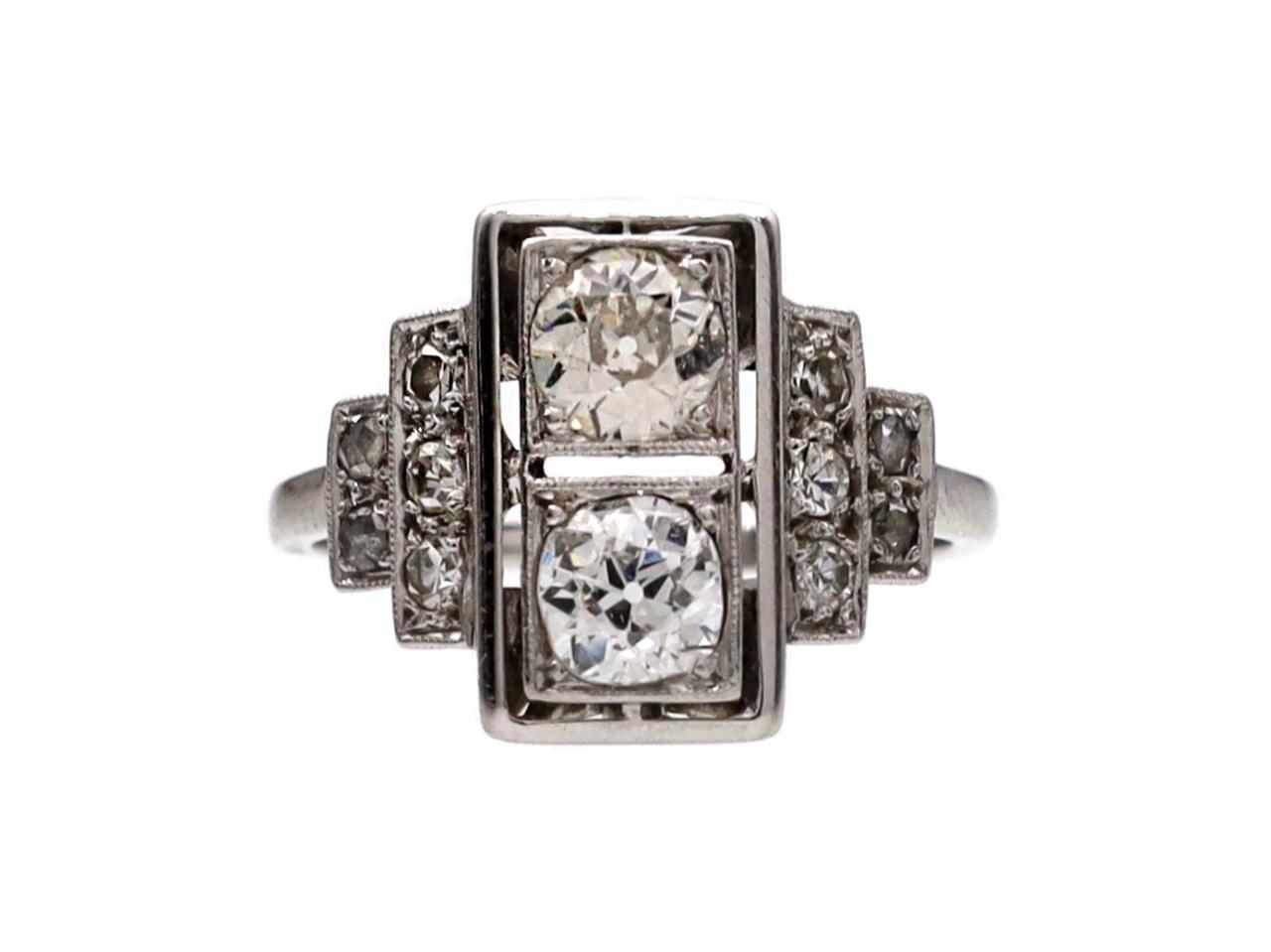 Art Deco style diamond two stone cluster ring in platinum. Set vertically with two round Old European cut diamonds in square collet settings, flanked to either side with round eight cut and rose cut diamonds, to a central rectangular plaque with openwork linear details, set to either side with diamond set steps, decorated throughout with millegrain borders and fitted with a structured gallery, the smooth shoulders flowing to a solid shank.