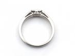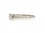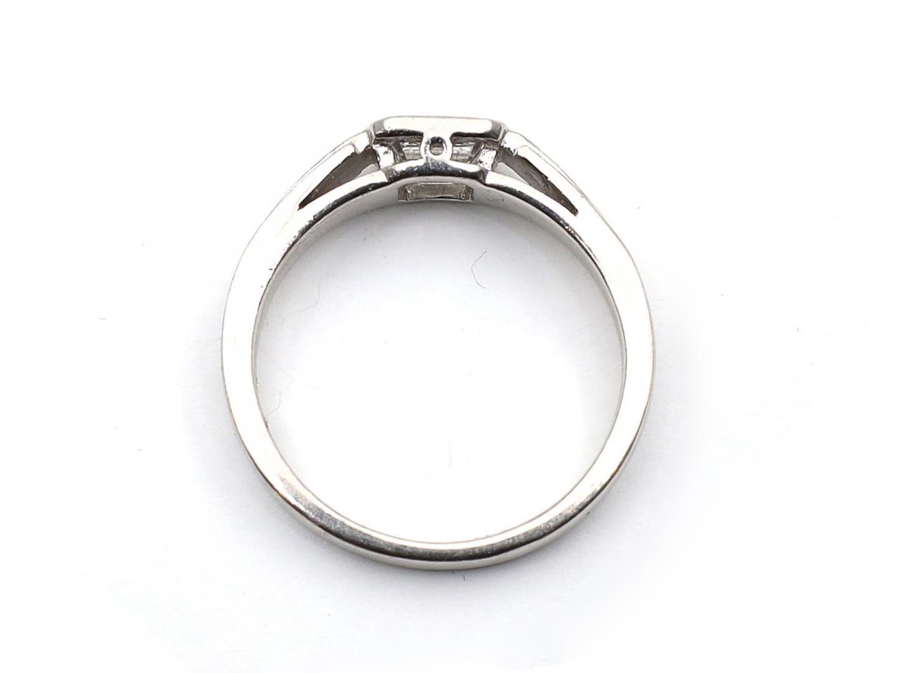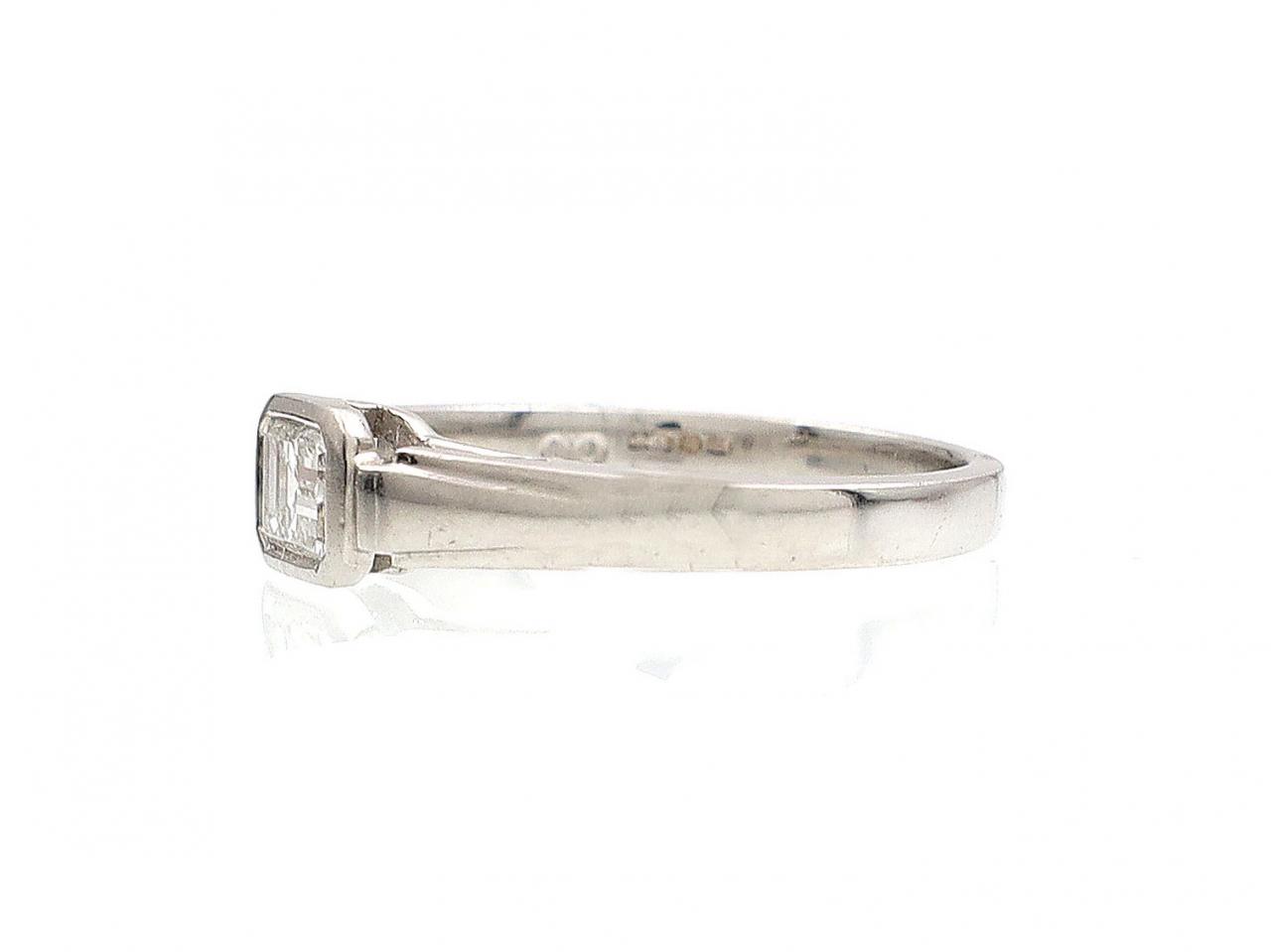 Art Deco style emerald cut diamond East to West diamond solitaire ring in platinum. Set with a 0.50ct octagonal emerald cut diamond in an East to West rubover setting, met to either side with geometric step shoulders which smooth to a solid shank. Hallmarked platinum.