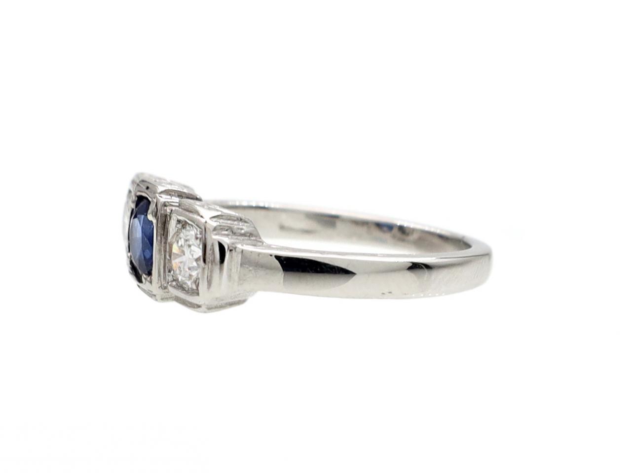 Art Deco style sapphire and diamond three stone ring in 18kt white gold. Centrally set with an estimated 0.30ct round mixed cut sapphire in a square collet setting, flanked to either side with two round brilliant cut diamonds in square collet settings, to a three stone design with step borders chaised gallery and raised square shoulders which curve to a solid shank. Marked 18kt gold.
