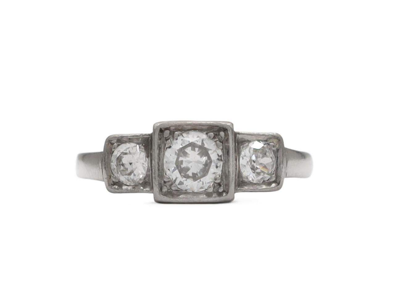 Art Deco three stone diamond ring in square platinum settings. Set across the finger with three round Old European cut diamonds in square collet settings, to a geometric graduating three stone design, featuring an open wirework gallery with decorative cheniers and met to either side with smooth slightly trumpeting shoulders which flow to a solid shank. Estimated total diamond weight 0.70cts. Hallmarked platinum, French importation mark.