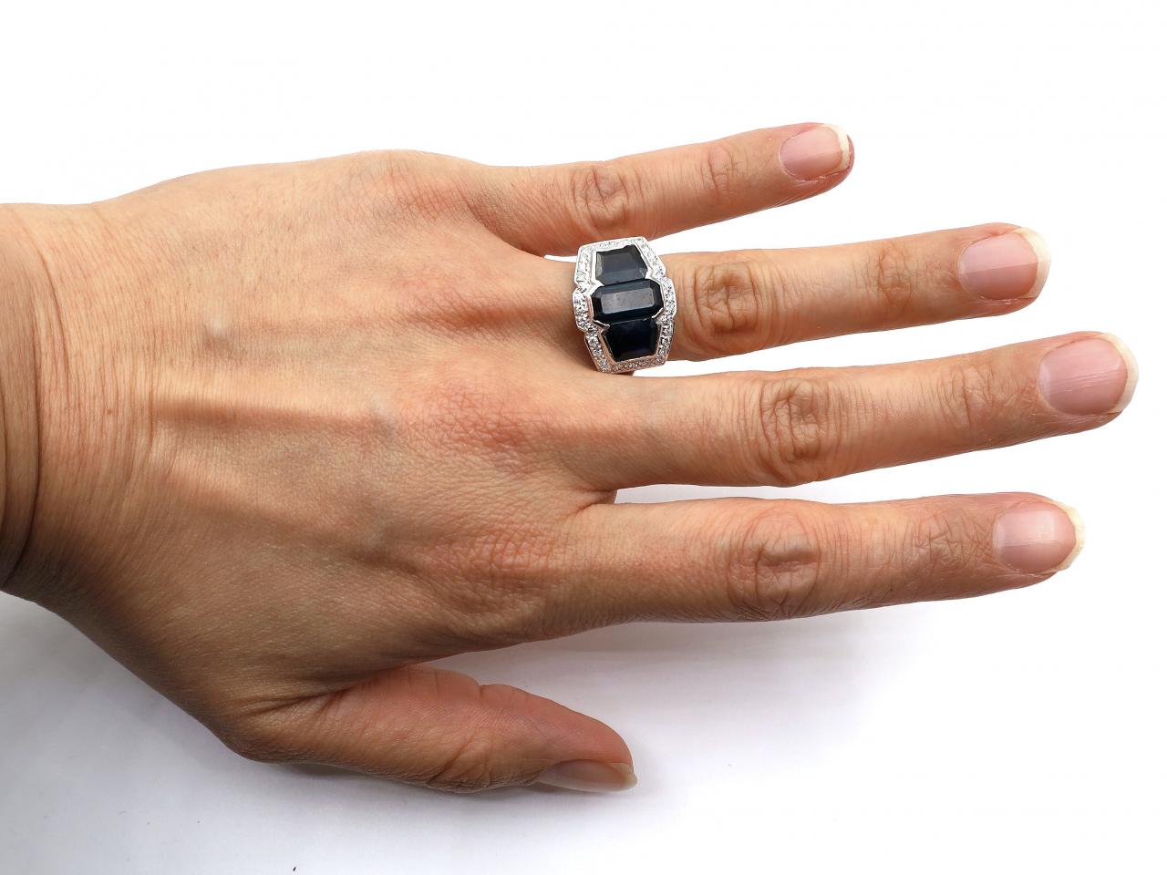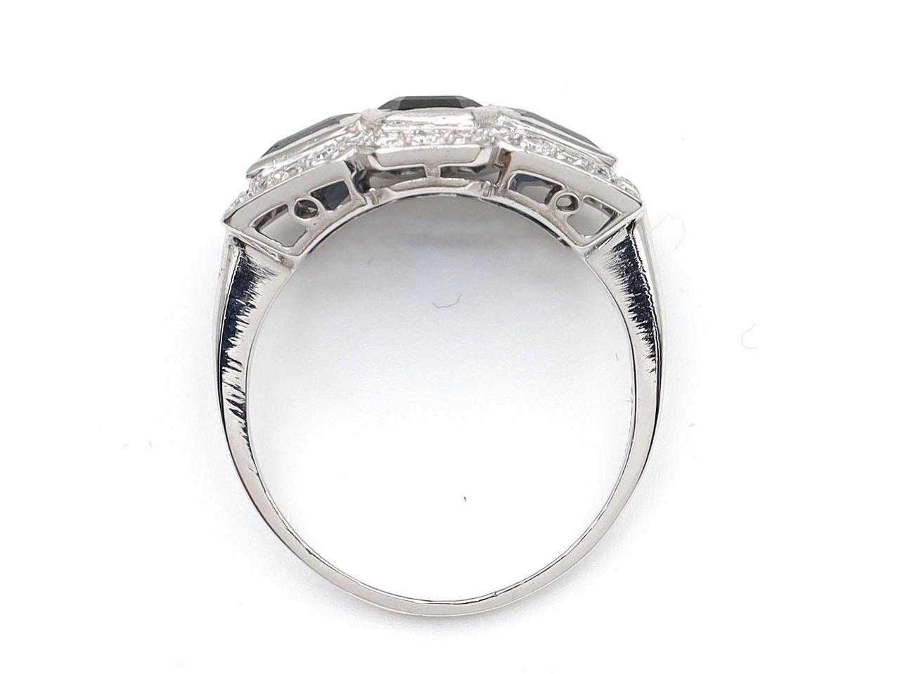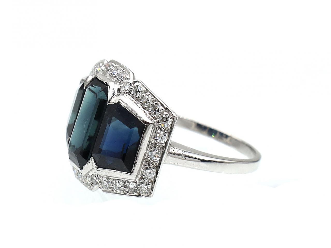 Art Deco three stone sapphire and diamond cluster ring in platinum. Centred with an octagonal emerald cut sapphire in a rubover setting, flanked by two tapered step cut sapphires in rubover settings, bordered by a row of round grain set diamonds, to a bold cluster design with millegrain decoration, chenier detailed open gallery and trumpeting shoulders which smooth to a solid shank.