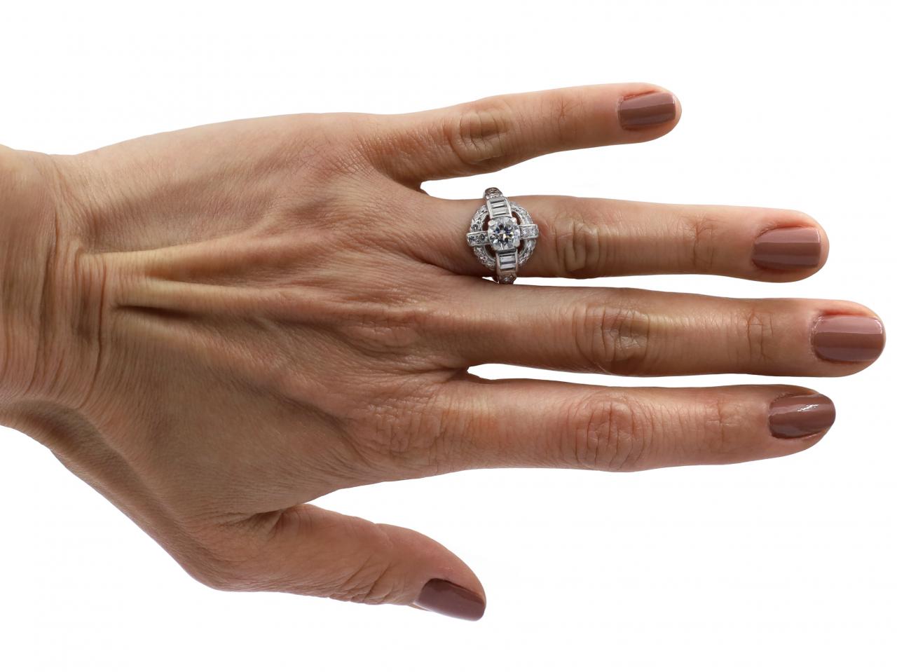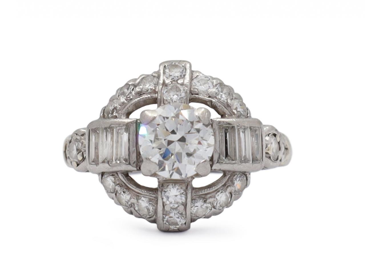 1950s Art Deco style unique diamond cluster ring in platinum. Centred with an estimated 0.74ct round transitional cut diamond