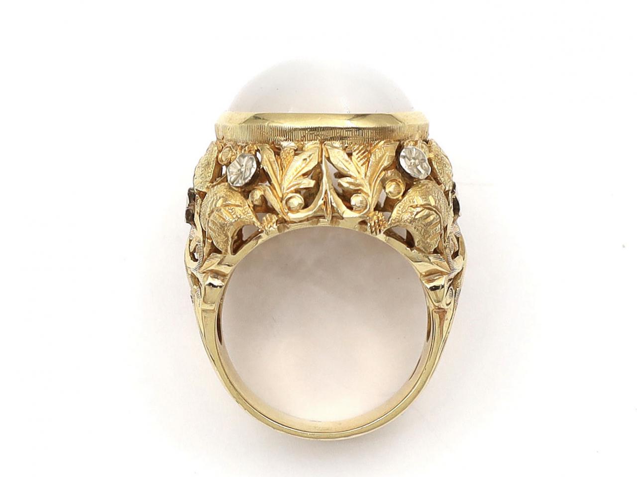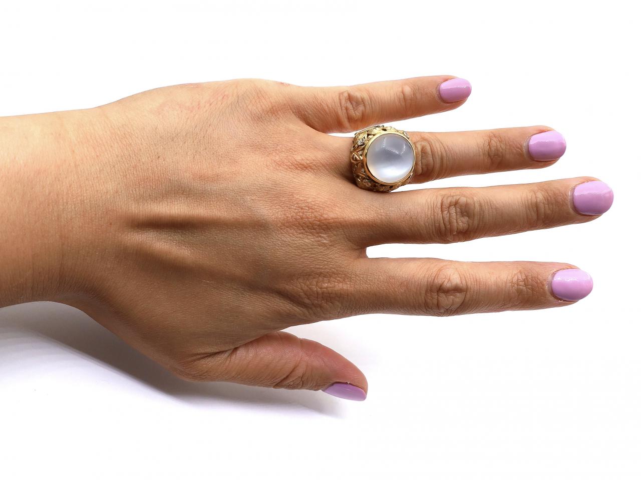 Art Nouveau 18kt yellow gold and moonstone bombe cocktail ring. Set with a round cabochon cut moonstone in a slightly raise rubover setting, to an elaborate surround with intricately carved leaf and white gold floral motifs which terminate to a solid shank. Marked 18kt gold.