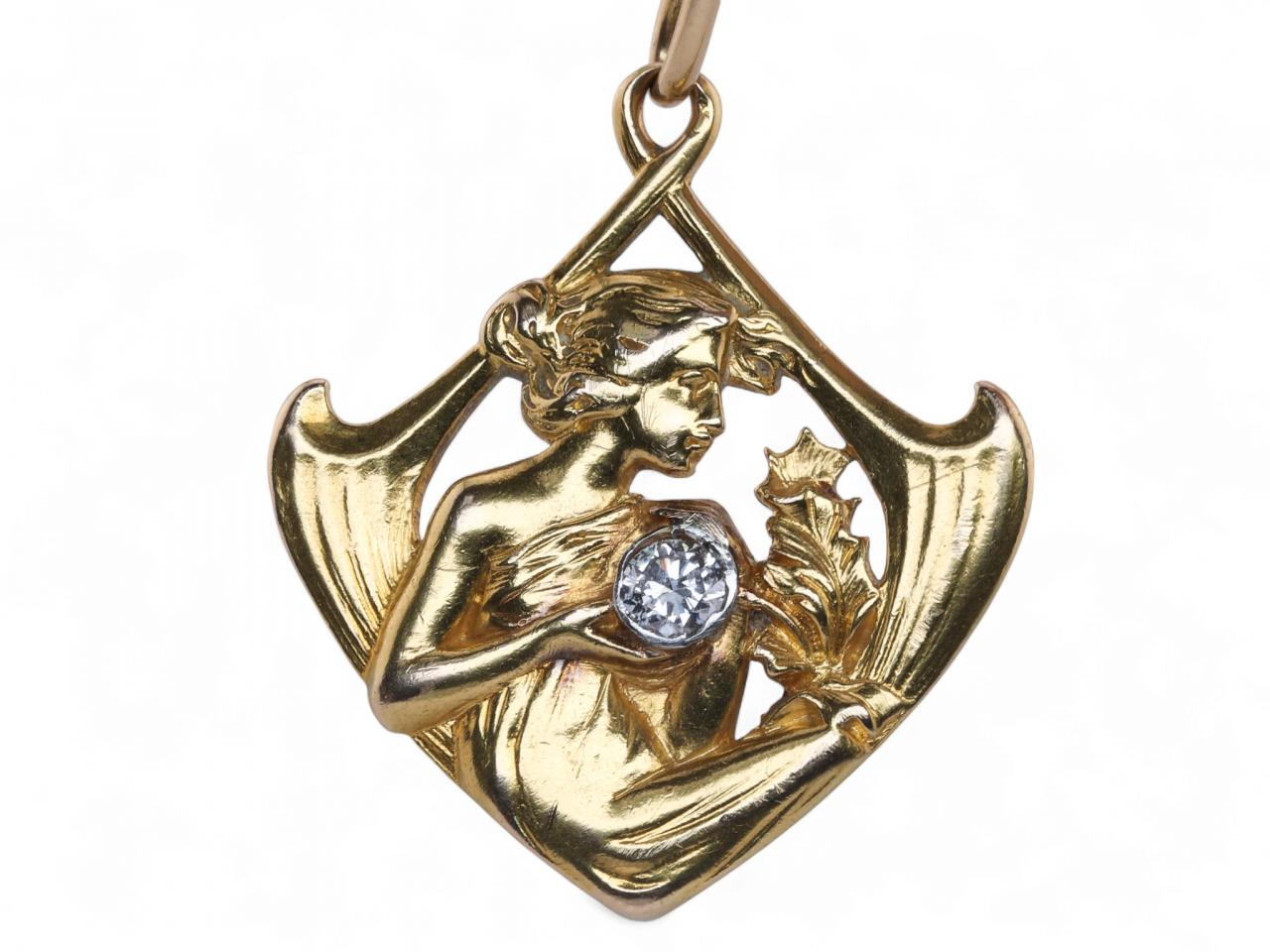 An Art Nouveau gold pendant signed by Masriera, featuring a sculpted female figure holding a bezel set old cut diamond, estimated weight 0.25 carats, colour F/G, clarity VS–SI.