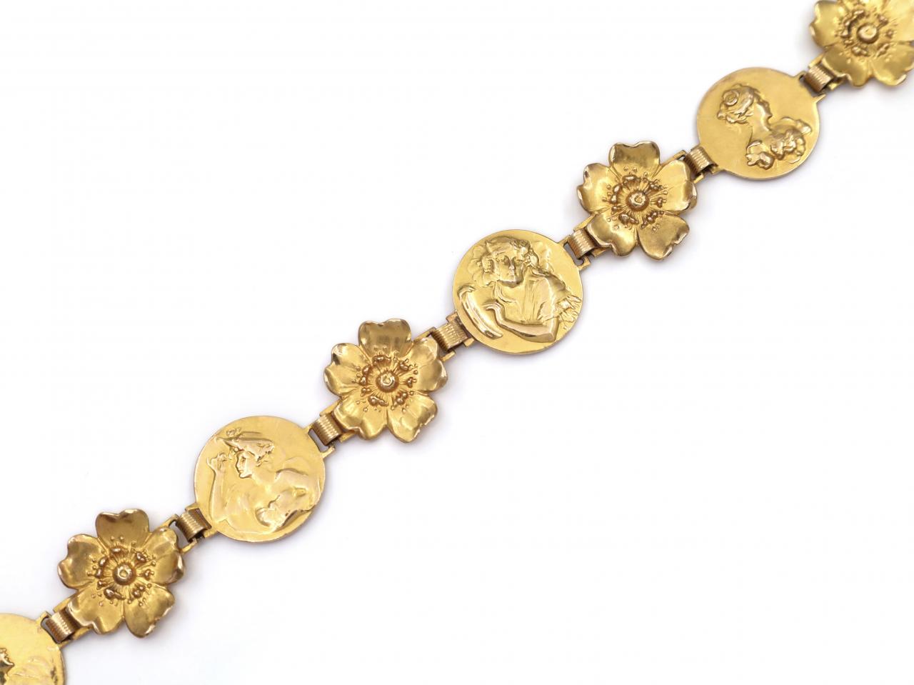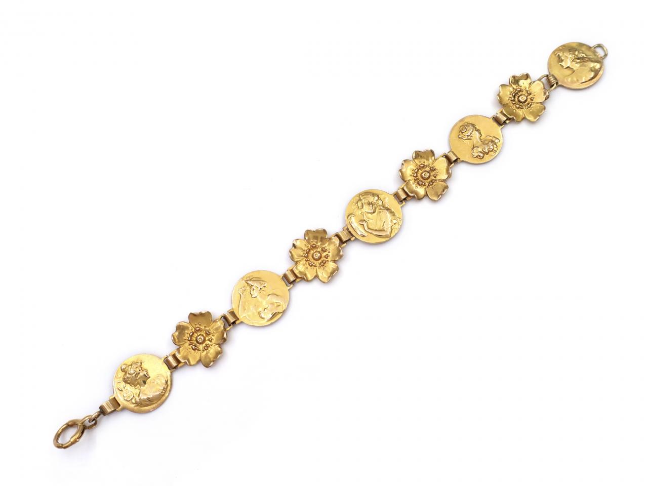 Art Nouveau flower and femme portrait bracelet in 18kt yellow gold.
