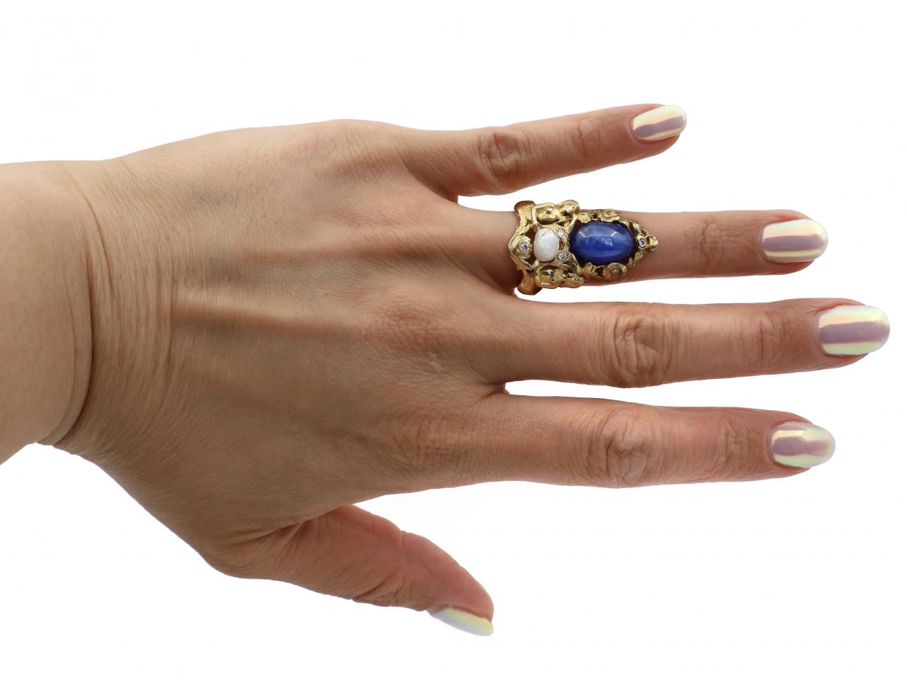 Art Nouveau style sapphire, pearl and diamond mermaid ring in 18kt yellow gold. Crowned with an oval cabochon sapphire in a bespoke setting, set betneath with a baroque natural pearl and decorated throughout with round brilliant cut diamonds in grain settings, to an impressive dress ring with chaised floral and foliate designs and flanked to either side with detailed shoulders featuring two mermaids which continue to the reverse.