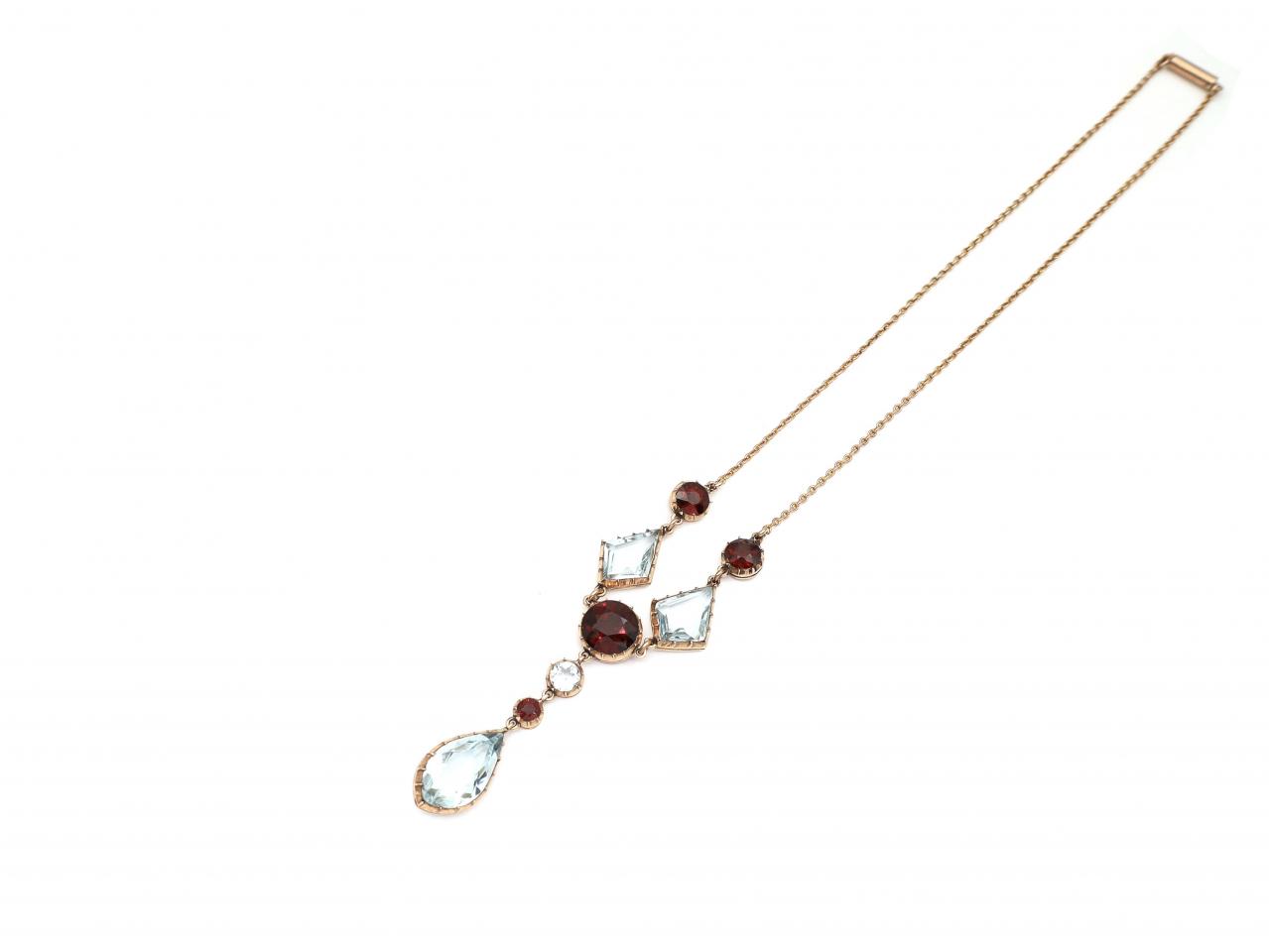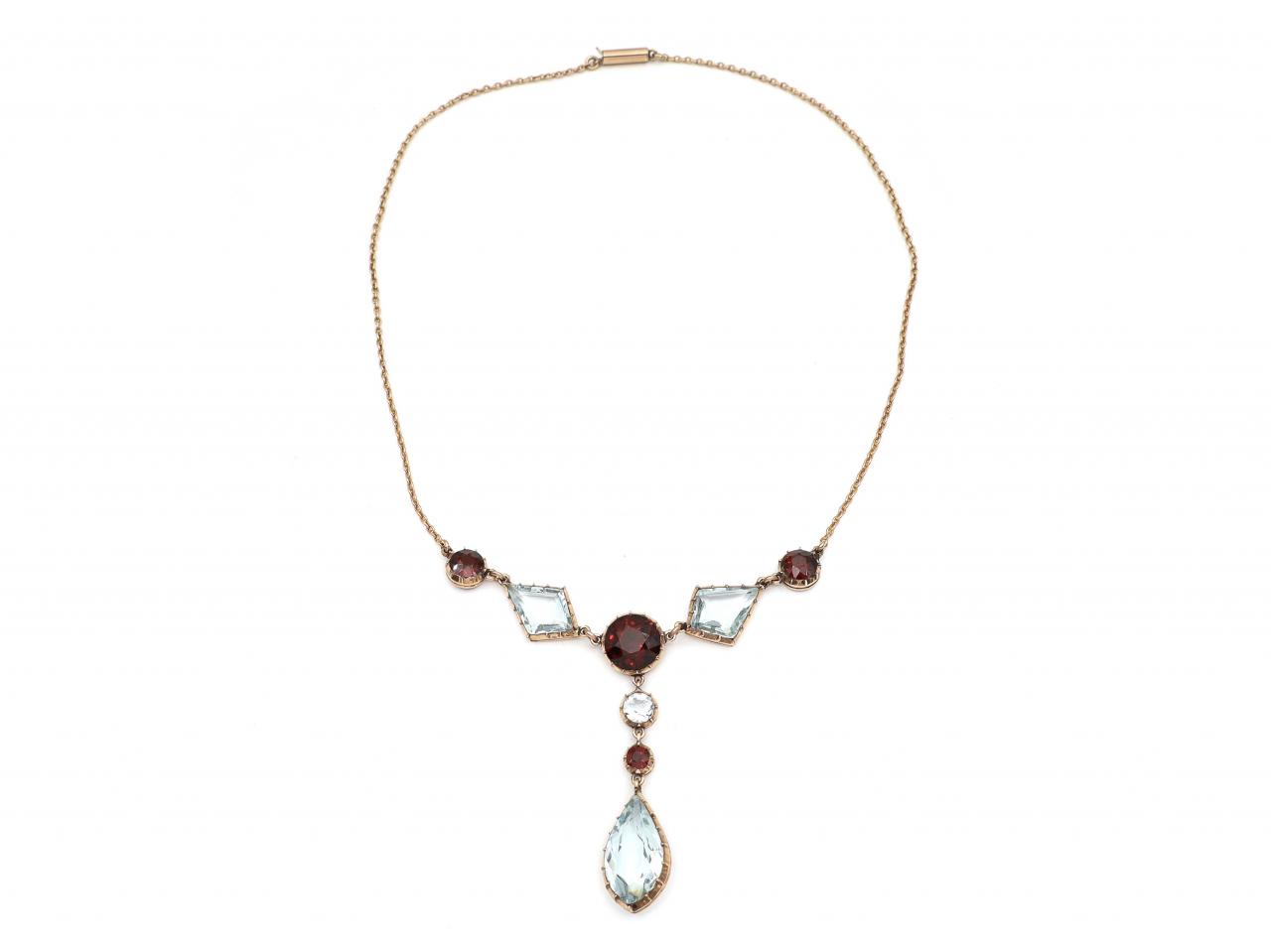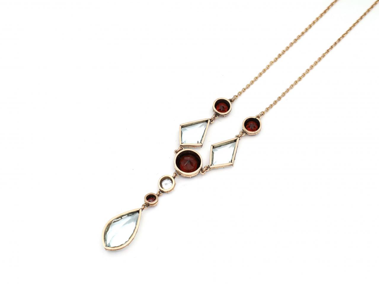 Arts and crafts aquamarine and almandine garnet drop necklace in 15kt gold.