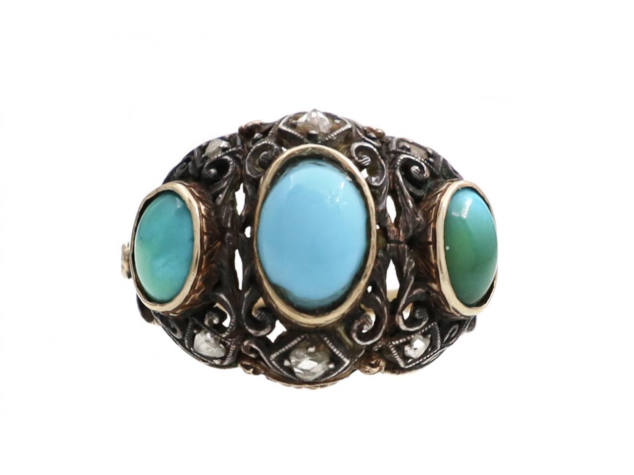 Bohemian turquoise and rose cut diamond ring in silver and gold.