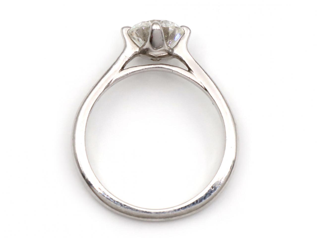 Boodles 1.20ct round brilliant cut diamond solitaire engagement ring in platinum. Centred with a 1.20ct round brilliant cut diamond, G colour, VS clarity in a four claw North, South, East, West setting, flanked to either side with raised inwardly tapering shoulders which smooth to a solid shank. Hallmarked platinum, London. Marker's mark Boodles.