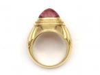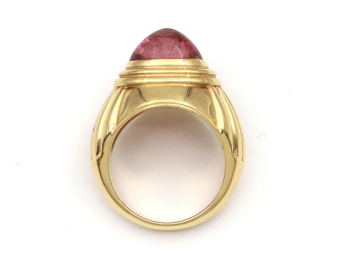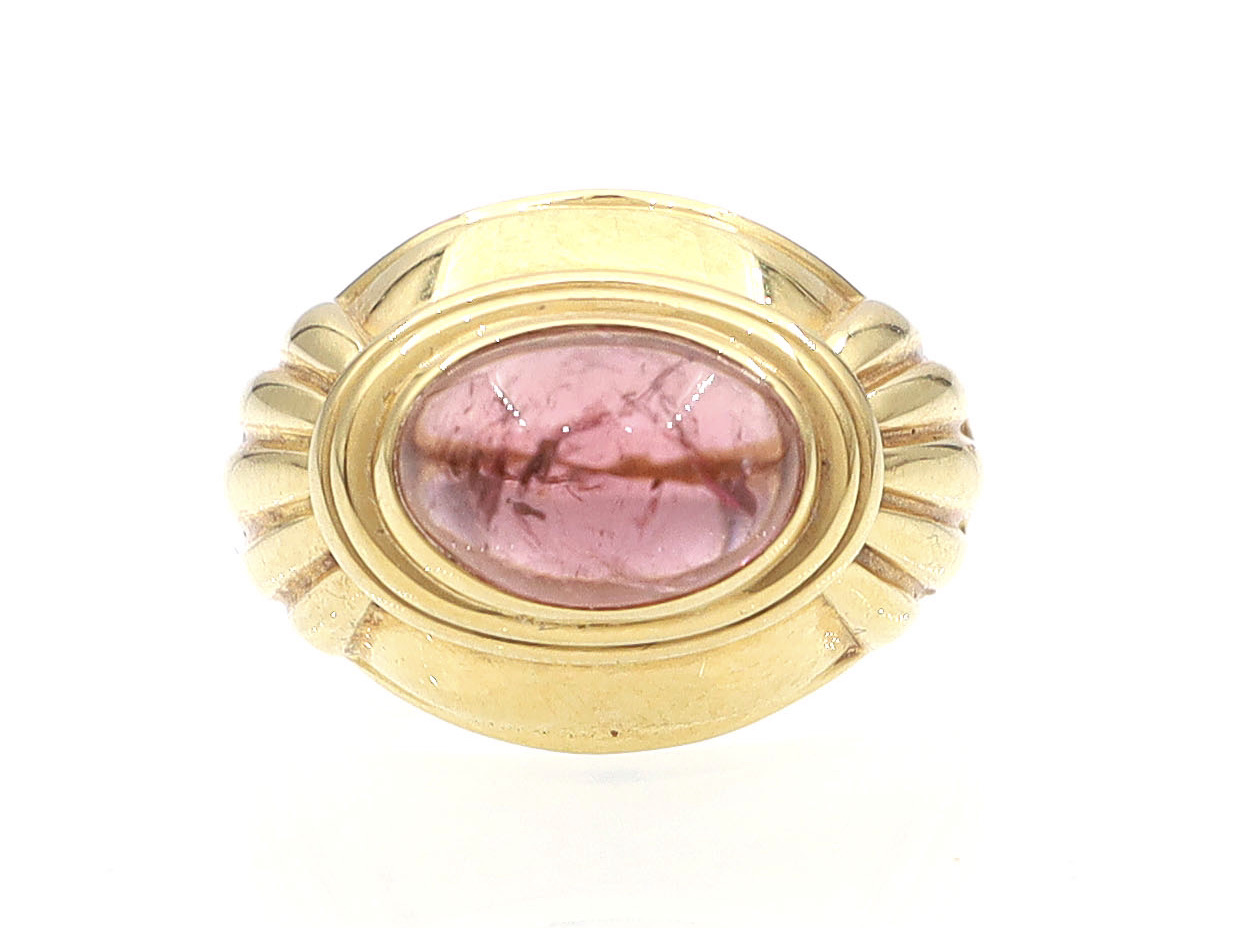 Boucheron Jaipur collection tourmaline ring in 18kt yellow gold. Centred with an oval sugarloaf rose quartz in a ribbed rubover setting, to a bombe style cocktail ring with fluted embellishment and integrated shoulders that curve to a solid shank. Hallmarked 18kt gold, French, numbered 'A5374401'. Signed 'BOUCHERON'.