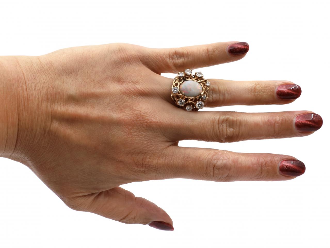 Brutalist opal and diamond ring in 14kt yellow gold. Centred with an oval cabochon cut opal in a stylised claw setting, encircled sporadically with nine round brilliant cut diamonds in raised claw settings, to a bold open wirework deisgn with textured finish, three-dimensional details and gallery which continue to the integrated shoulders which taper and terminate to a solid shank. Marked 14kt gold. Estimated total diamond weight 1.30cts.
