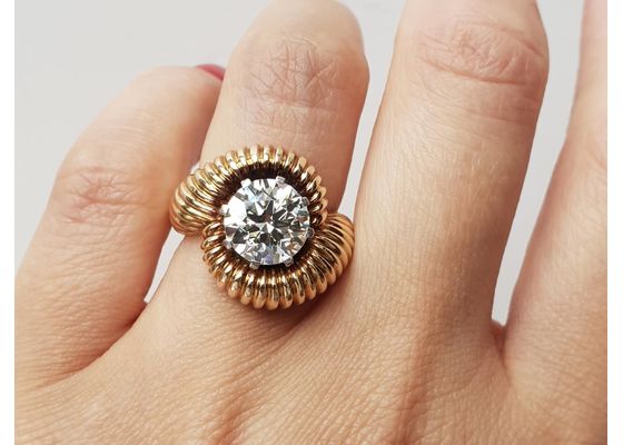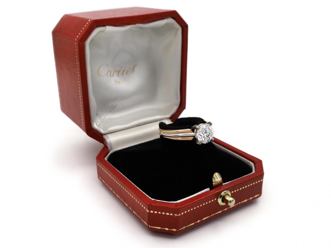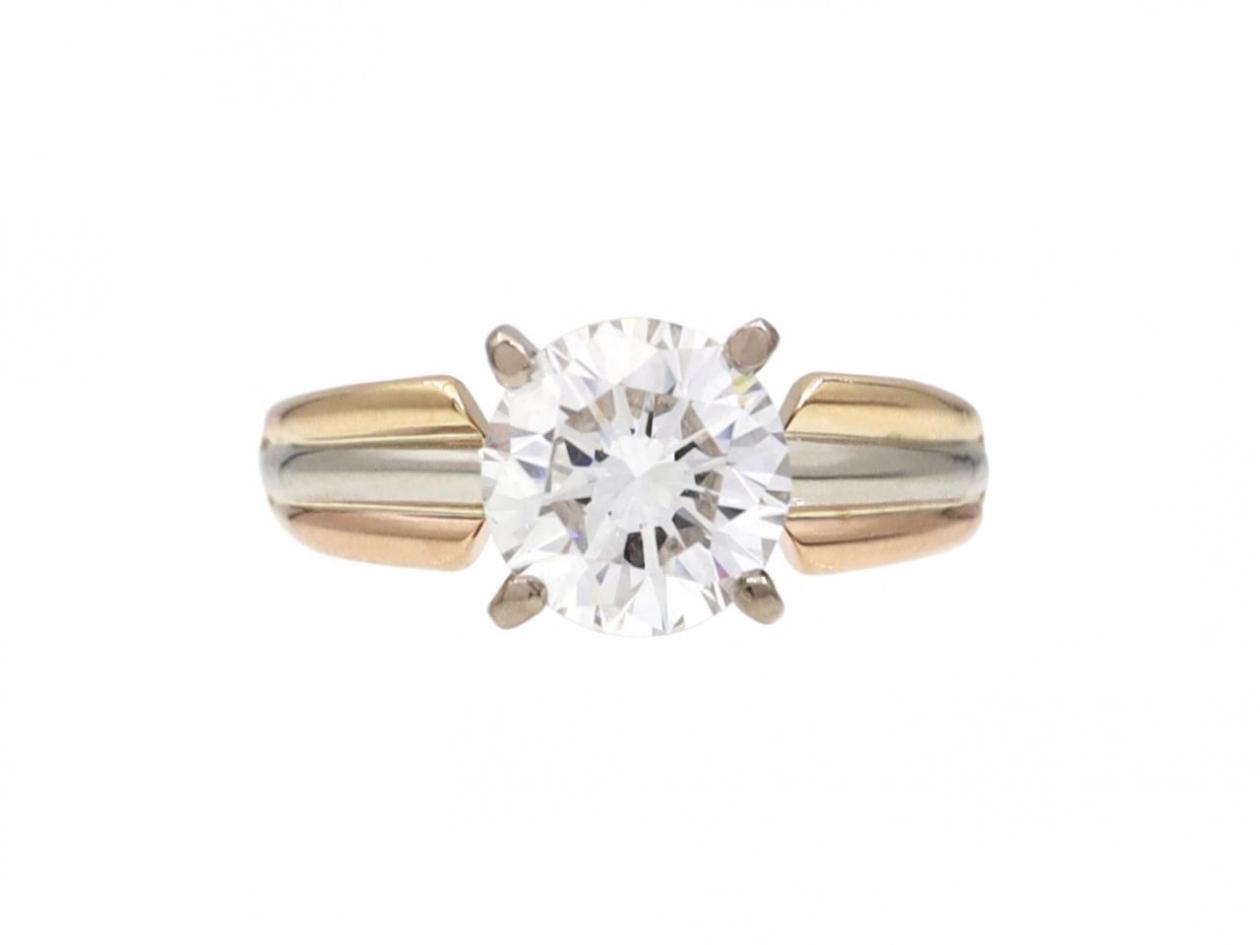 Cartier mounted diamond solitaire engagement ring in 18kt tri-gold. Centrally set with a round brilliant cut diamond with GIA report stating 2.01cts, E colour, VS1 clarity in a raised four claw setting, to a traditional solitaire design featuring a structured collet, curving claws and met to either side with raised pointed shoulders decorated with yellow, white and rose gold in ribbed formation terminating to a smooth yellow gold shank. Numbered '0702'. Hallmarked 18kt gold, London, 1994. Signed 'Mtd Cartier London'. Accompanied by Gemological Institute of America certificate no.16138426.