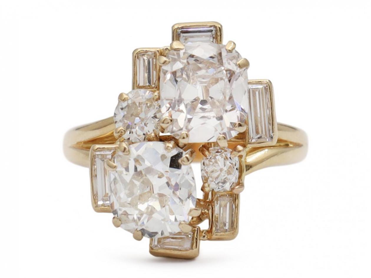 Cartier Monture cushion shape two stone diamond cluster ring in 18kt yellow gold. Set with a cushion shape Old Mine cut diamond in a split claw setting, diagonally set with a cushion shape Old Mine cut diamond in a split claw setting, embellished throughout with six rectangular baguette cut diamonds in rubover settings and highlighted with two round brilliant cut diamonds in four claw settings, to an impressive vertical design with asymetric qualities, curving claws, polished settings and structured gallery, the chunky split open shoulders smoothly join and continue to a solid shank. Marked 18kt gold, French. Signed 'MONTURE CARTIER'.