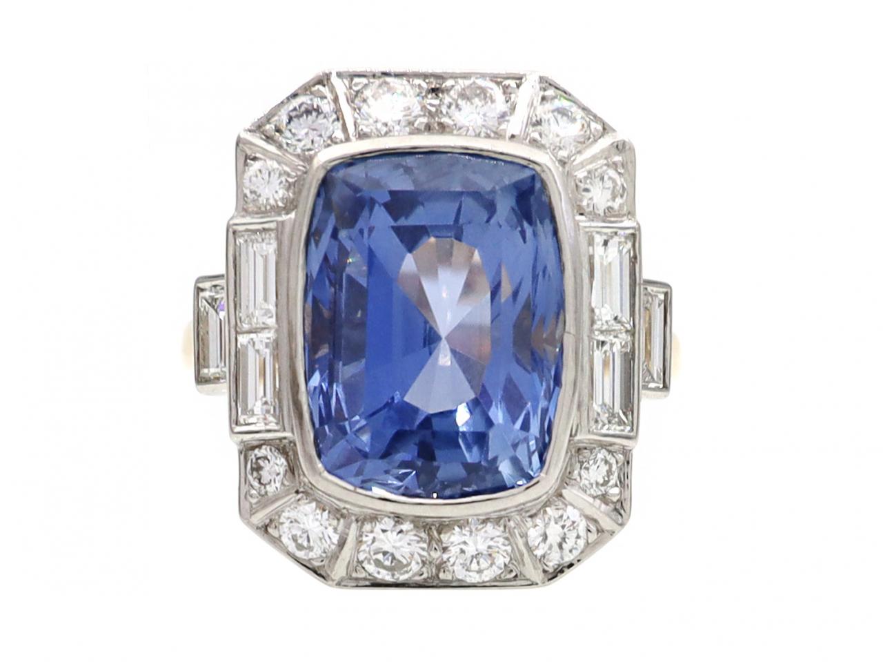 Ceylon sapphire and diamond geometric cluster ring in platinum and 18kt yellow gold. Centred with a cushion shape mixed cut Ceylon sapphire with no indications of heat treatment in a rubover setting, bordered by a mix of round old cut diamonds in grain settings and rectangular baguette cut diamonds in channel and rubover settings, to an octagonal cluster design with millegrain intervals and intricately pierced open gallery, further enhanced by raised diamond set shoulders which smooth to a solid shank.