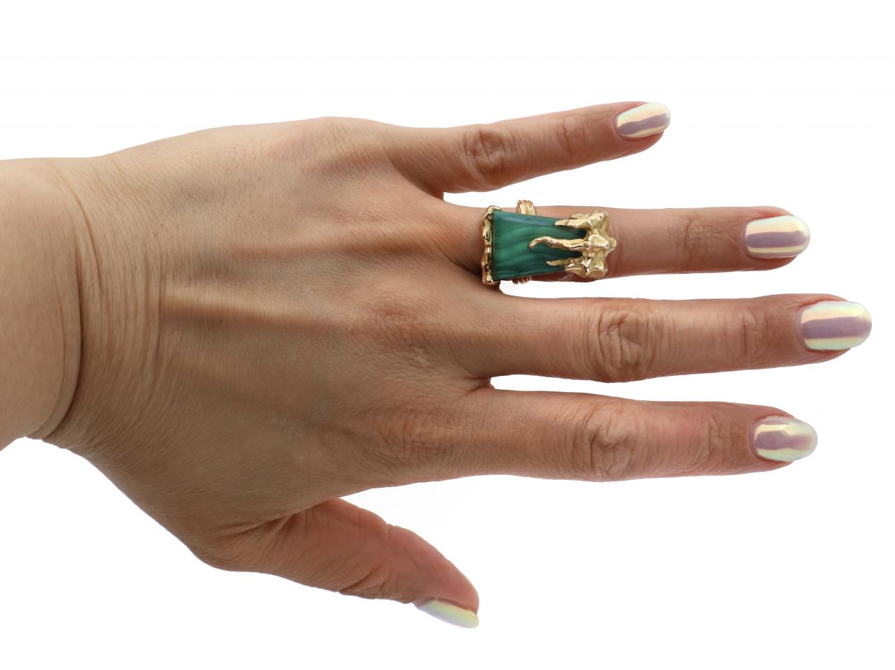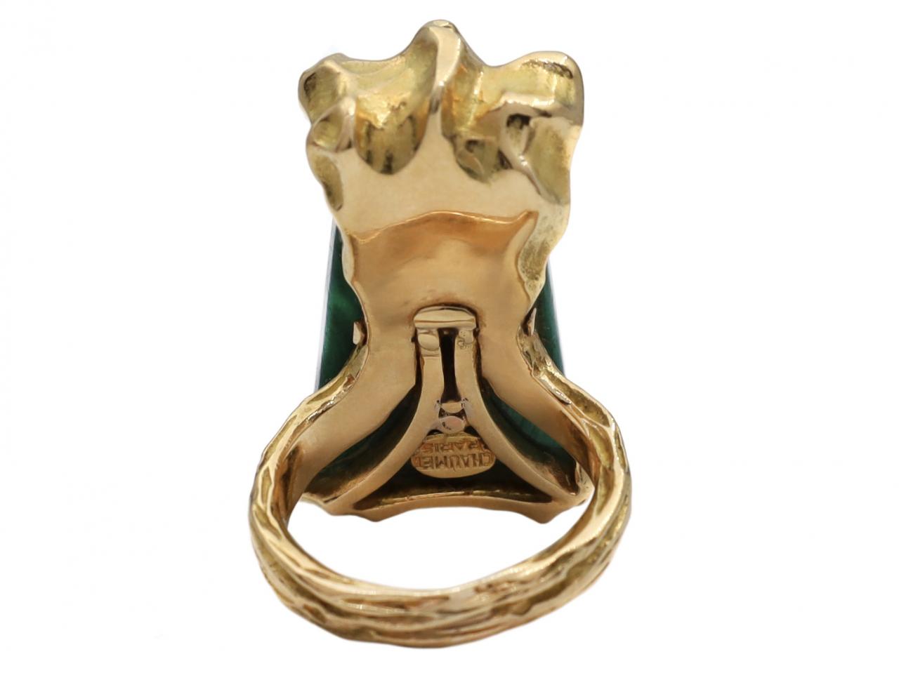 Chaumet 1970s malachite and 18kt yellow gold dress ring. Set with a trapezoid tablet of malachite in a fancy textured setting, to an impressive statement ring featuring dripping gold with deeply patterned and incised details, met to either side with sweeping textured shoulders which continue to the reverse. Hallmarked 18kt gold, French. Marker's mark Chaumet. Signed 'CHAUMET PARIS'.