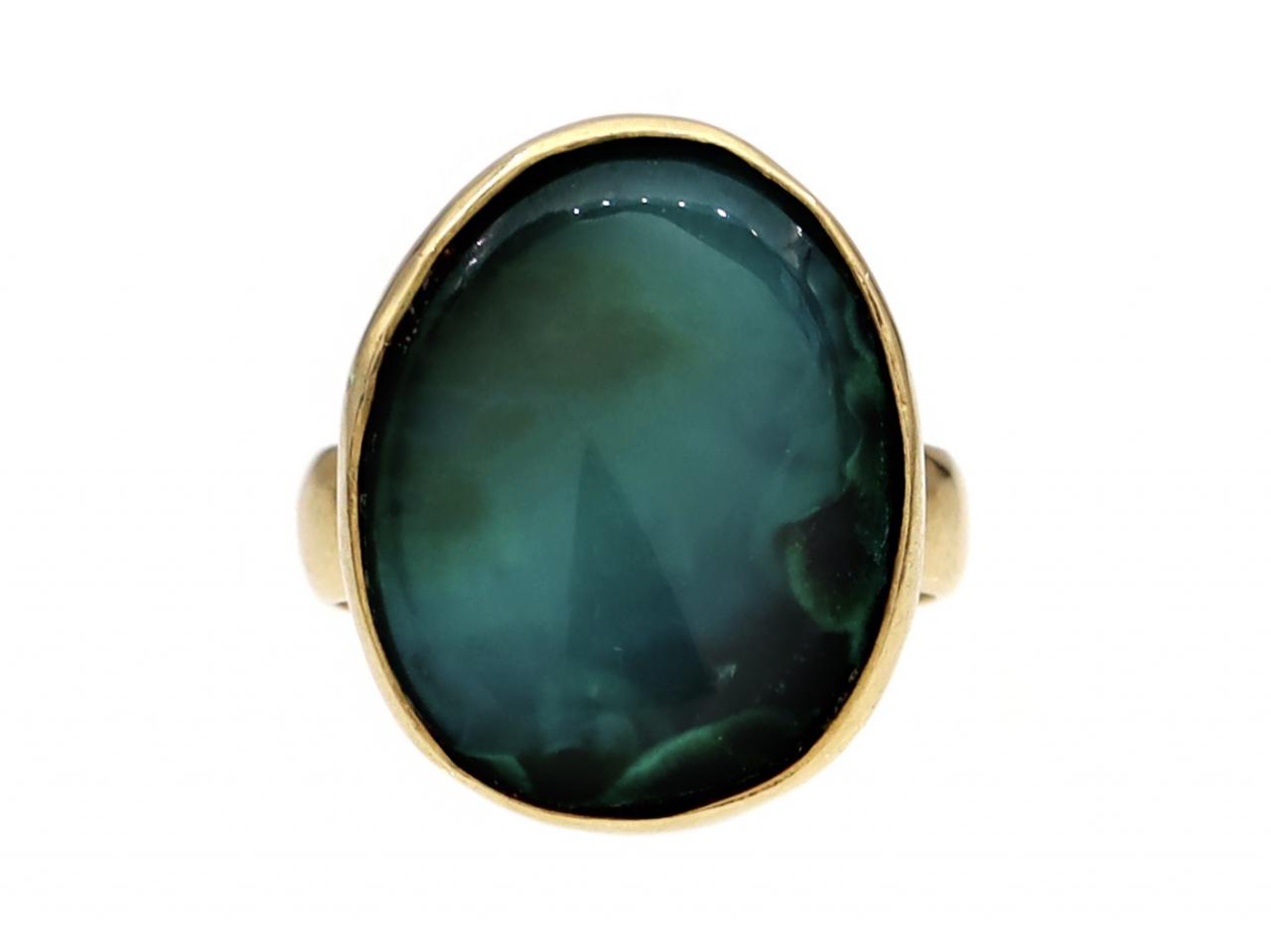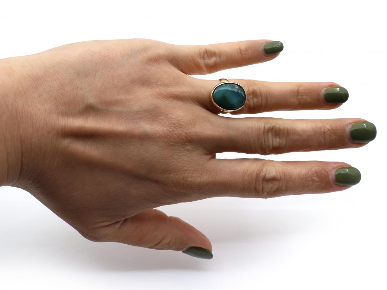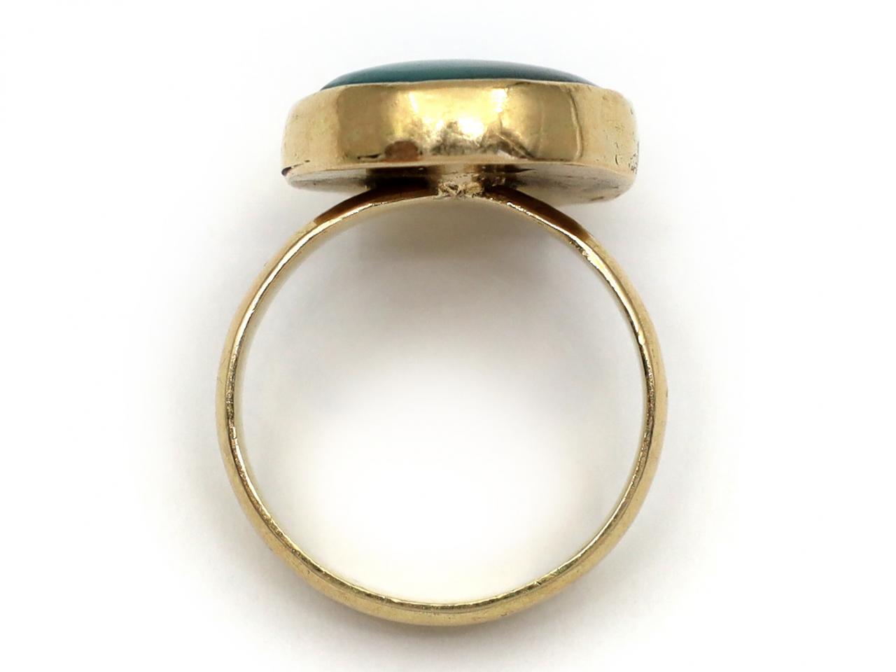 Chrysocolla oval dress ring in yellow gold. Set with an oval cabochon cut chrysocolla in a rubover setting, sitting atop a broad curved shank. Tested 14kt gold.