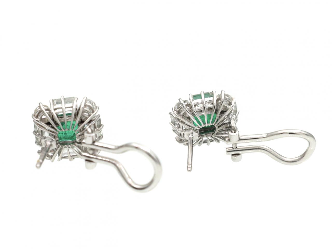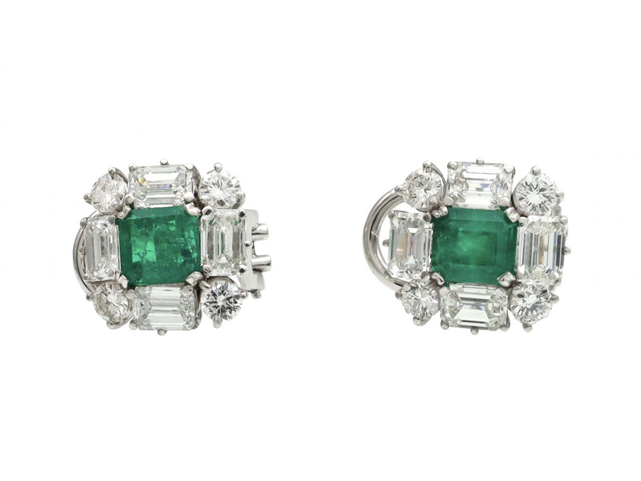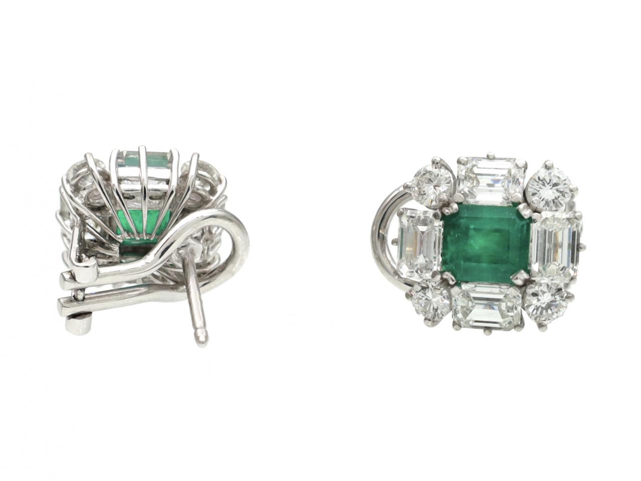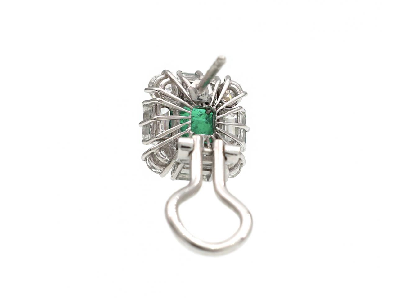 Colombian emerald and diamond square cluster earrings. A matching pair of earrings, each centrally set with an octagonal emerald cut Colombian emerald in a split claw setting, framed by alternating round brilliant cut diamonds and rectangular baguette cut diamonds in claw settings, to a striking square cluster with structured claws, radiating linear gallery and secured with a solid post and hinged omega clip fitting.