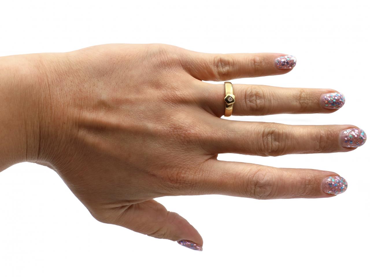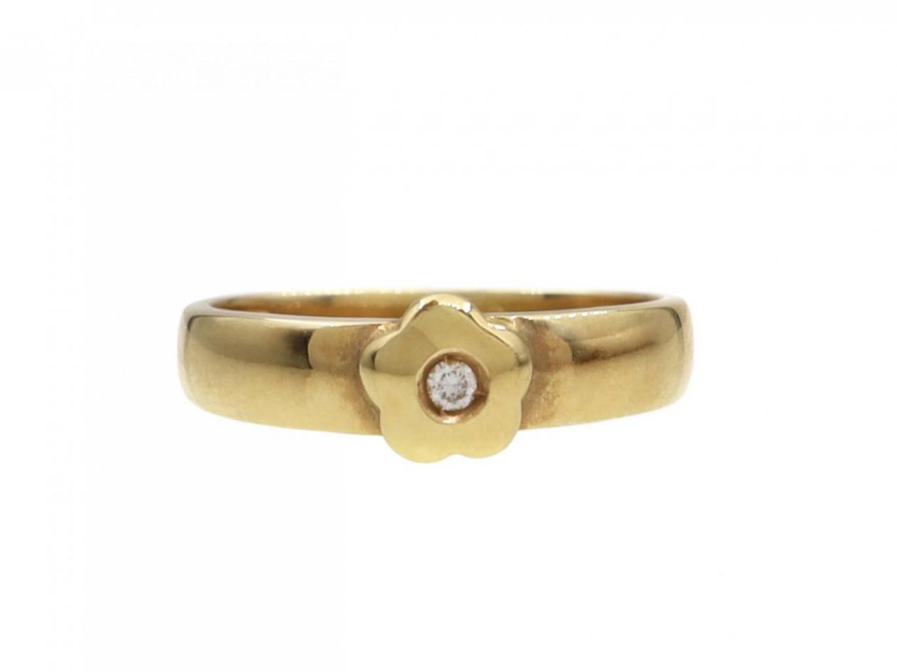 Contemporary 18kt yellow gold diamond set flower ring. A wide polished band centred with a five petal flower motif set with a single round brilliant cut diamond in a grain setting. Hallmarked 18kt gold.