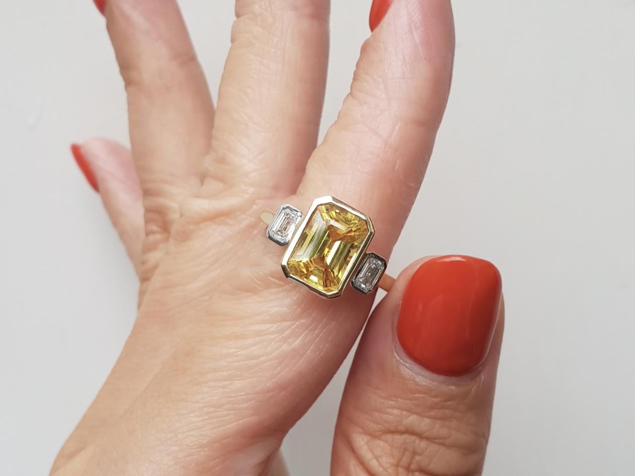 Contemporary 2.50ct fancy yellow sapphire and diamond ring in platinum and 18kt yellow gold. Centred with an estimated 2.50ct octagonal emerald cut fancy yellow sapphire in a yellow gold rubover collet setting, flanked by two octagonal emerald cut diamonds in platinum rubover collet settings, to a graduating three stone design with smooth, polished settings, structured gallery and met to either side with raised shoulders which flow to a solid shank. Estimated total diamond weight 0.40cts. Hallmarked 18kt gold, platinum, London, convention marks.