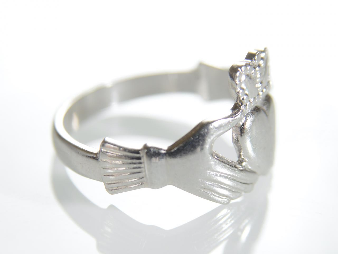 Contemporary Irish platinum Claddagh ring. Carved to the centre the Claddagh motif of the crowned heart clasped by cuffed hands which terminate to a solid shank. Marked platinum 'MADE IN IRELAND'.