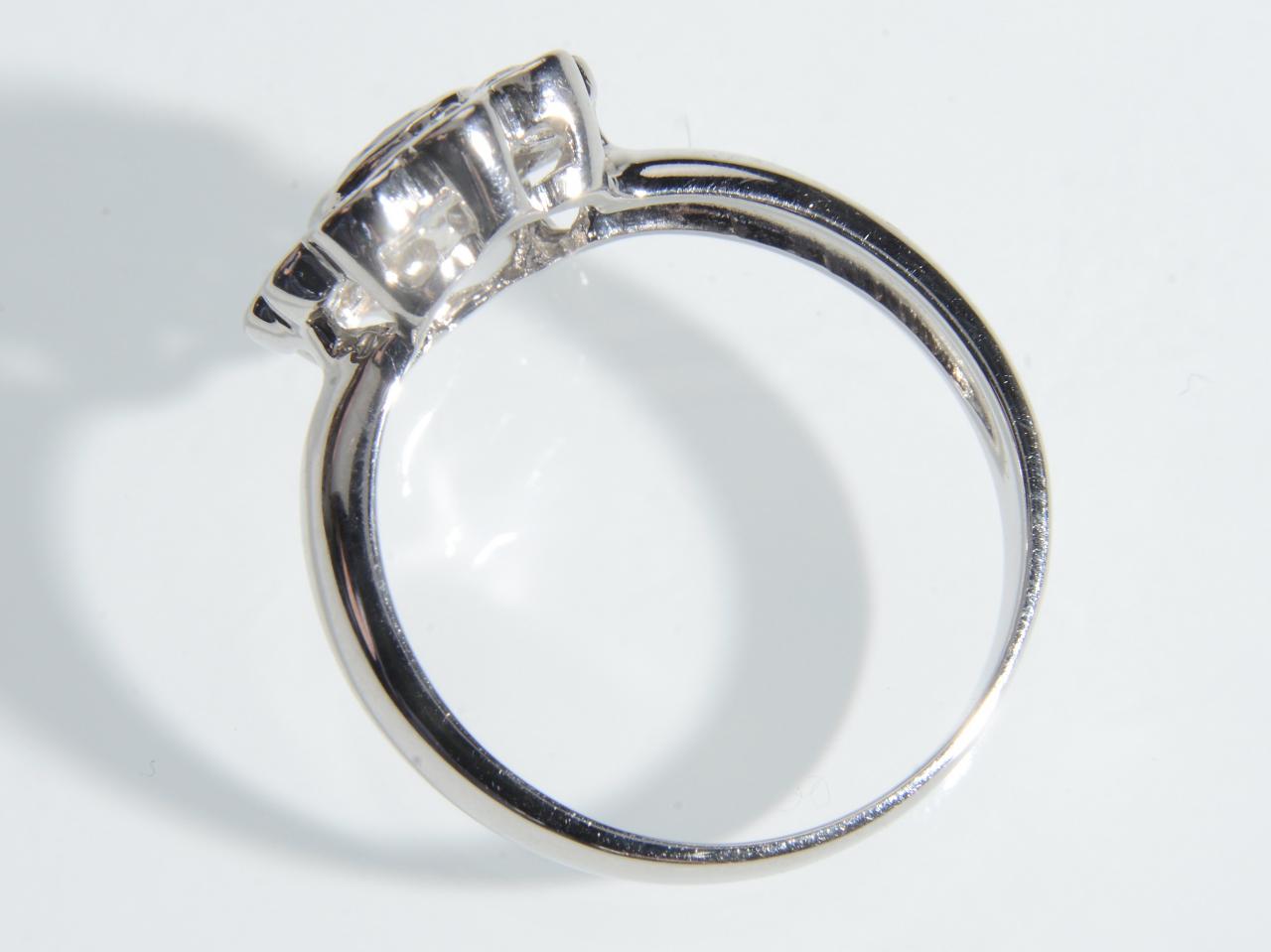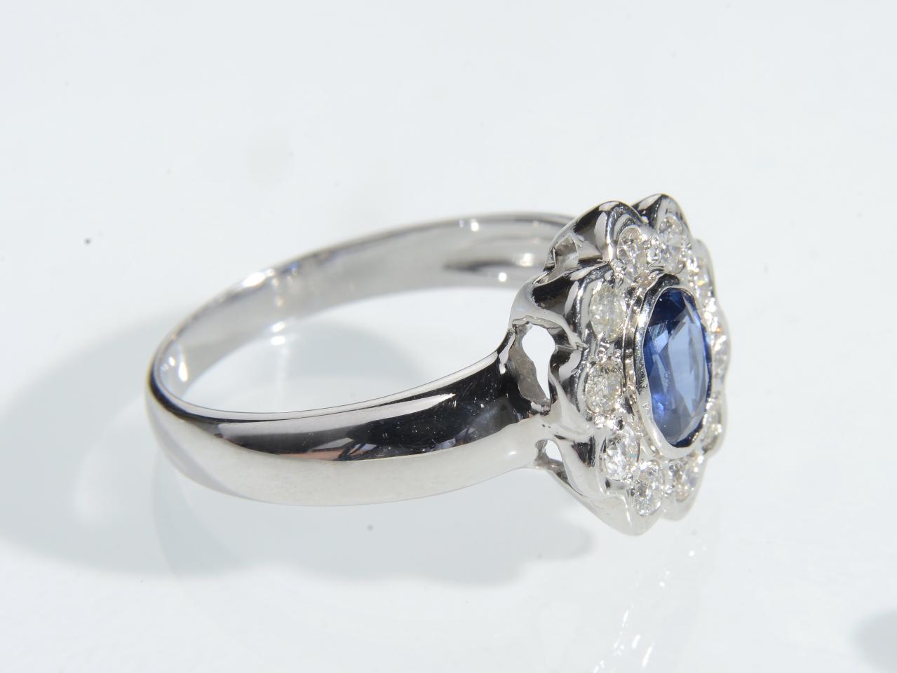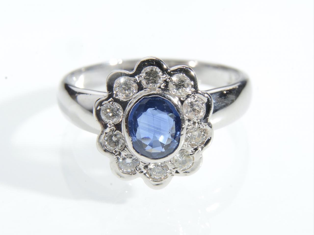 Contemporary sapphire and diamond floral cluster ring in 18kt white gold, set with an oval mixed cut sapphire in a rubover setting, surrounded by round brilliant cut diamonds in rubover settings, to an elegant oval cluster with scalloped edging and pierced gallery, flanked to either side with broad trumpeting shoulders which slightly taper to a solid shank. Marked 18kt gold.