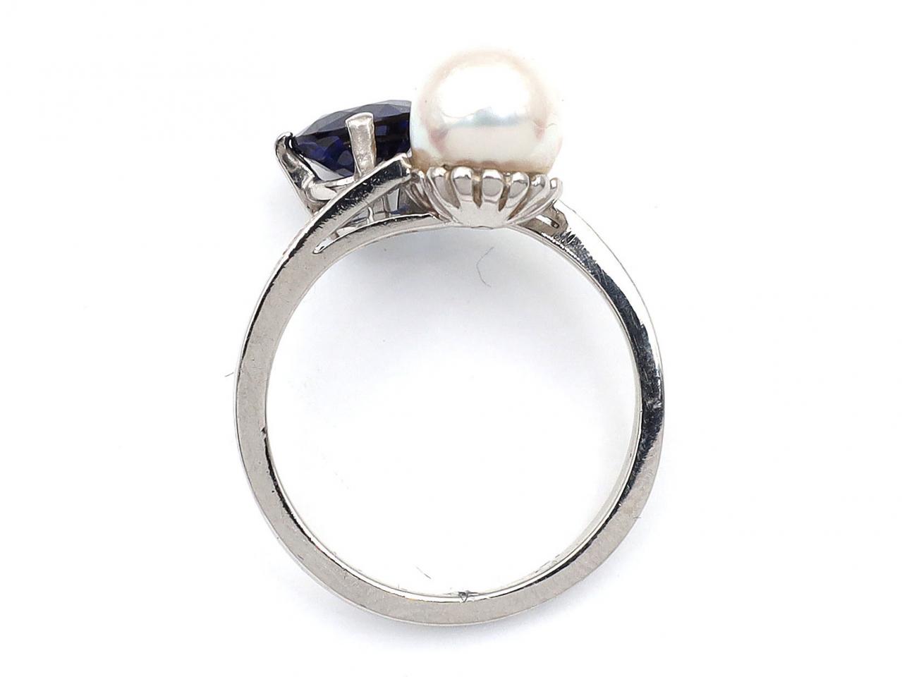 Cultured pearl and sapphire crossover ring in 18kt white gold. Adjacently set with a cultured pearl and a round mixed cut sapphire stylised settings, flanked by twist shoulders set with diamonds and terminating to a smooth shank. Marked 18kt gold.