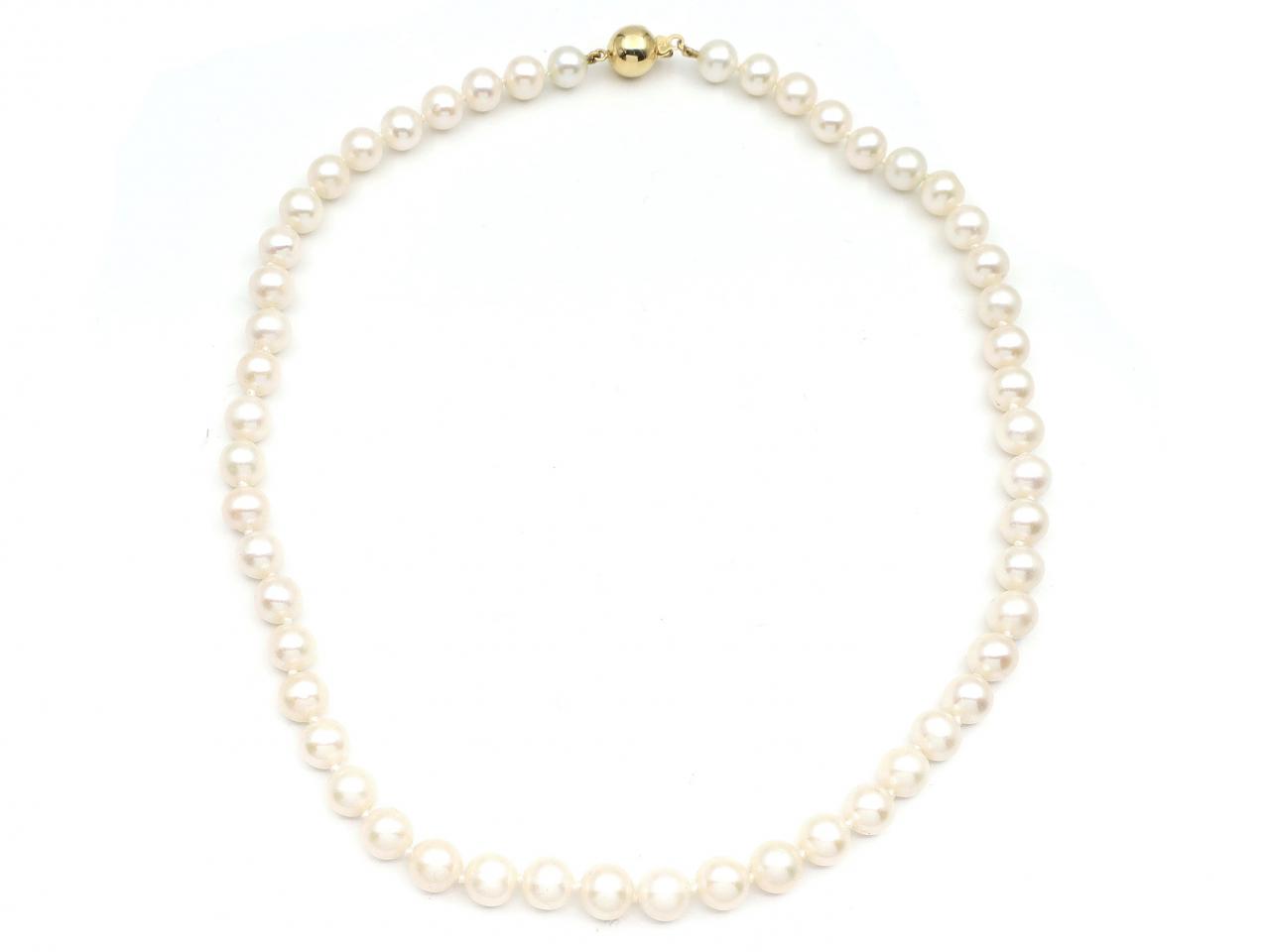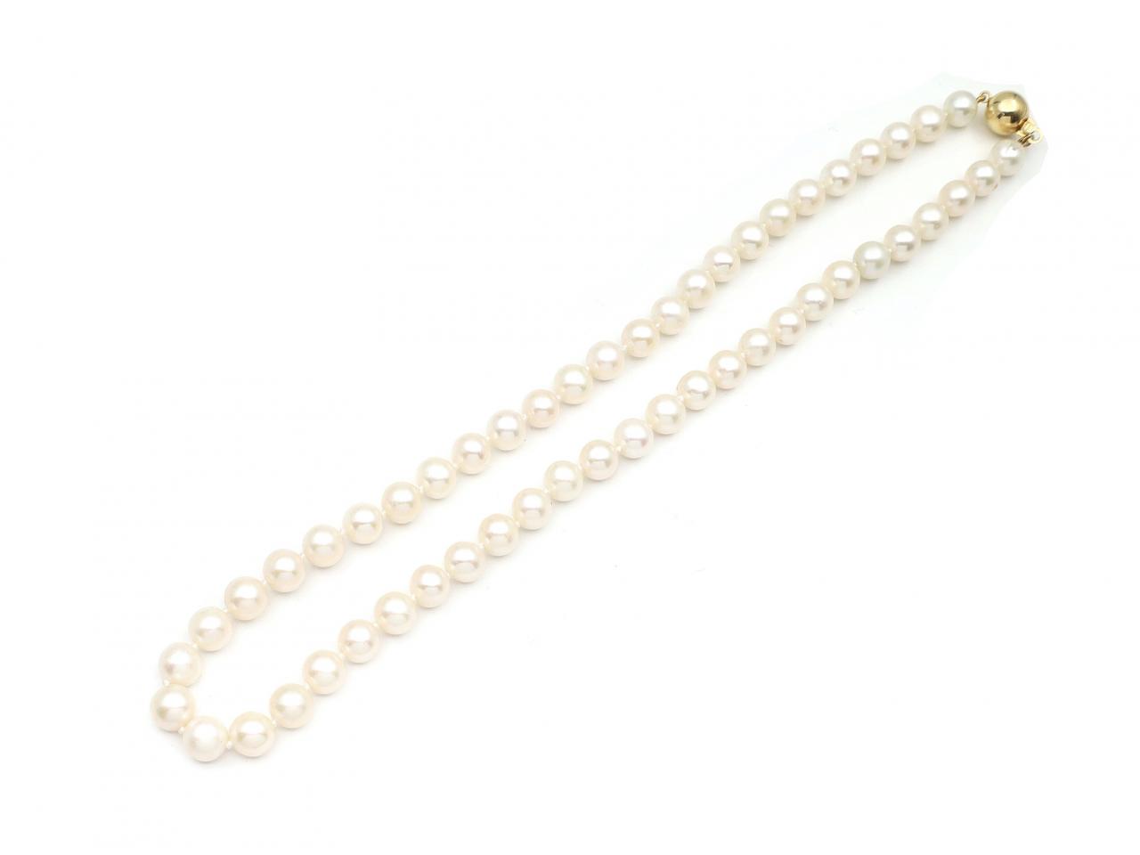 Cultured pearl necklace with 18kt yellow gold clasp. A uniformed cultured pearl necklace with each pearl knotted into place, fitted to the reverse with a globular push clasp fitting in 18kt yellow gold. Marked 18kt yellow gold.