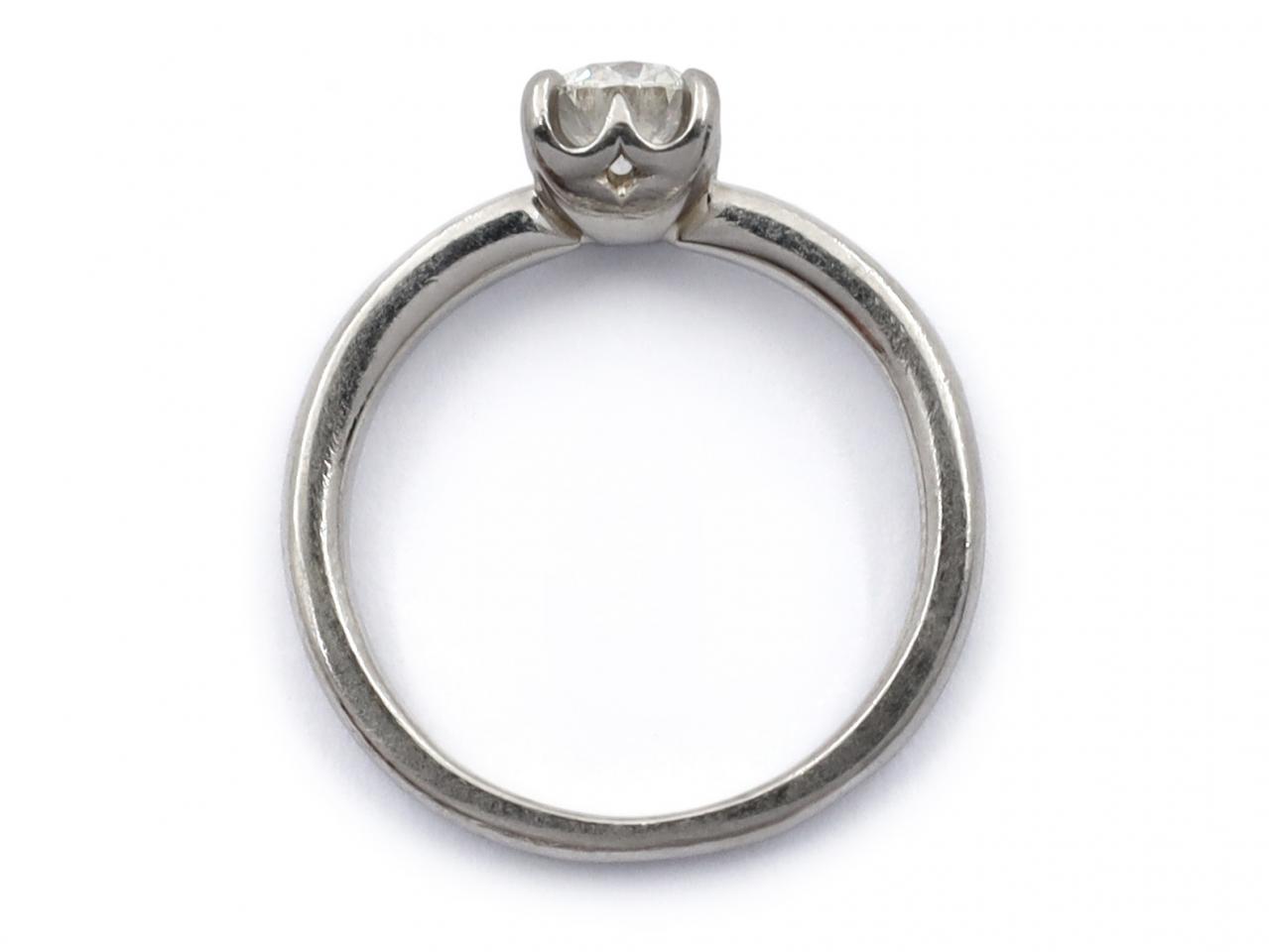 De Beers 0.45ct round brilliant cut diamond solitaire engagement ring in platinum. Set with an estimated 0.45ct round brilliant cut diamond in a four claw setting, the fine shoulders curve to a solid shank. Set to the inner with a round brilliant cut diamond in an inset setting. Marked platinum. Signed 'DEBEERS'.