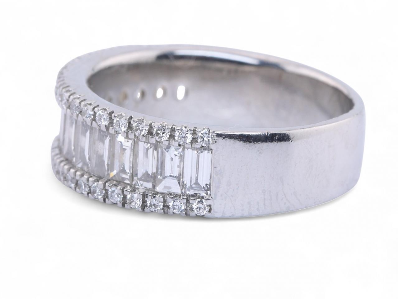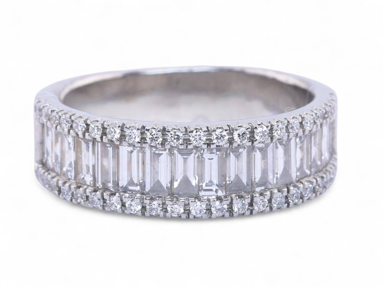 An eternity ring channel-set with baguette-cut diamonds estimated at 1.30 carats, alternated with round brilliant-cut diamonds estimated at 0.40 carats. The diamonds have a combined estimated weight of 1.70 carats, assessed as G/H colour and VS clarity. Finger size N½.