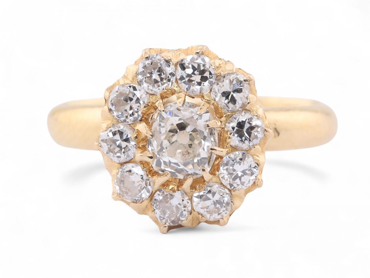 An antique diamond cluster ring, set to the centre with a cushion-cut diamond estimated at 0.58 carats, within a surround of old mine cut diamonds totalling approximately 0.45 carats. Mounted in 19k gold.