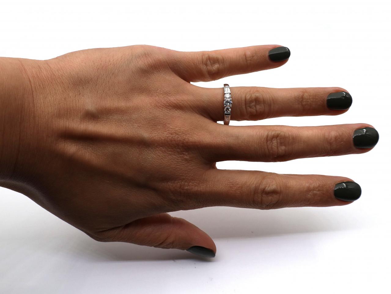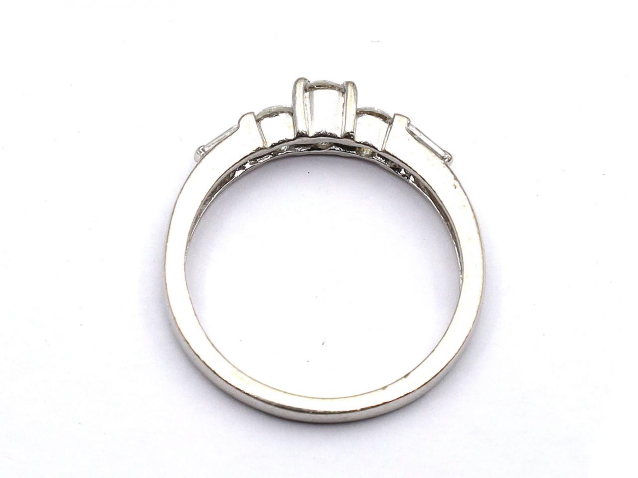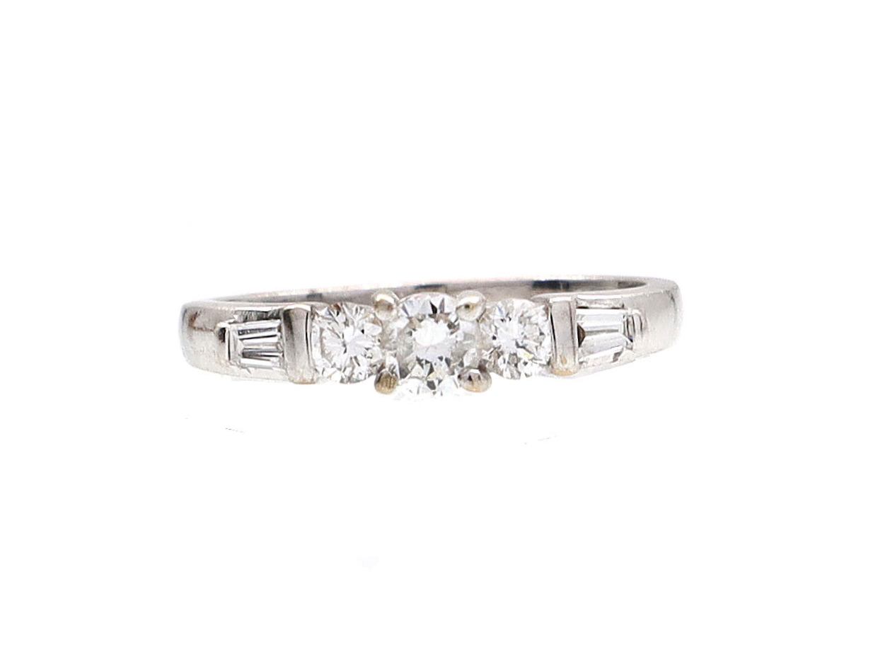 Diamond flanked solitaire engagement ring in 18kt white gold. Centrally set with a round brilliant cut diamond in a raised four claw collet setting, set to either side with two round brilliant cut diamonds in tension settings, further flanked by two tapering baguette cut diamonds in tension settings, the integrated shoulders curve to a solid shank. Estimated total diamond weight 0.42cts. Hallmarked 18kt gold.