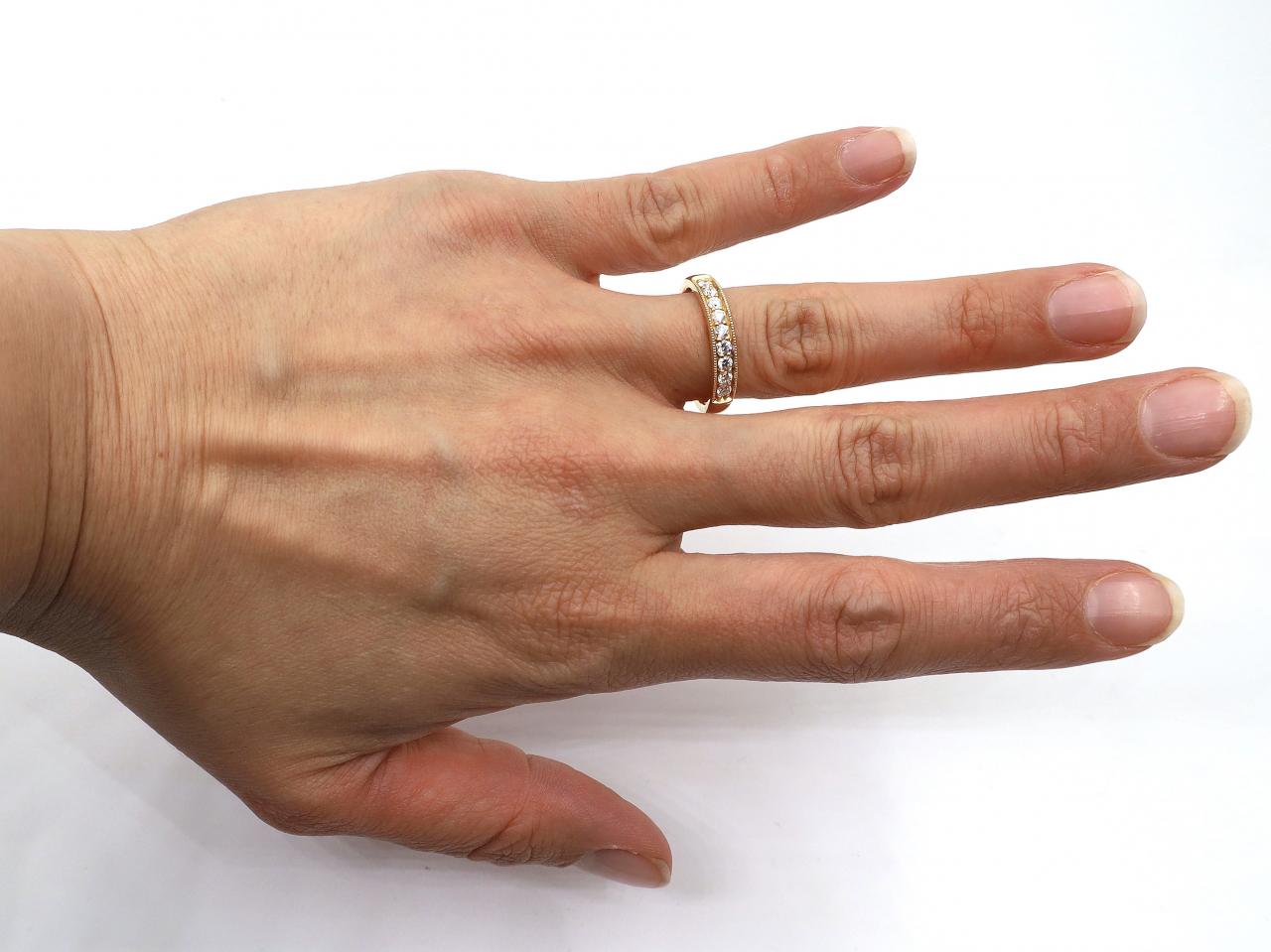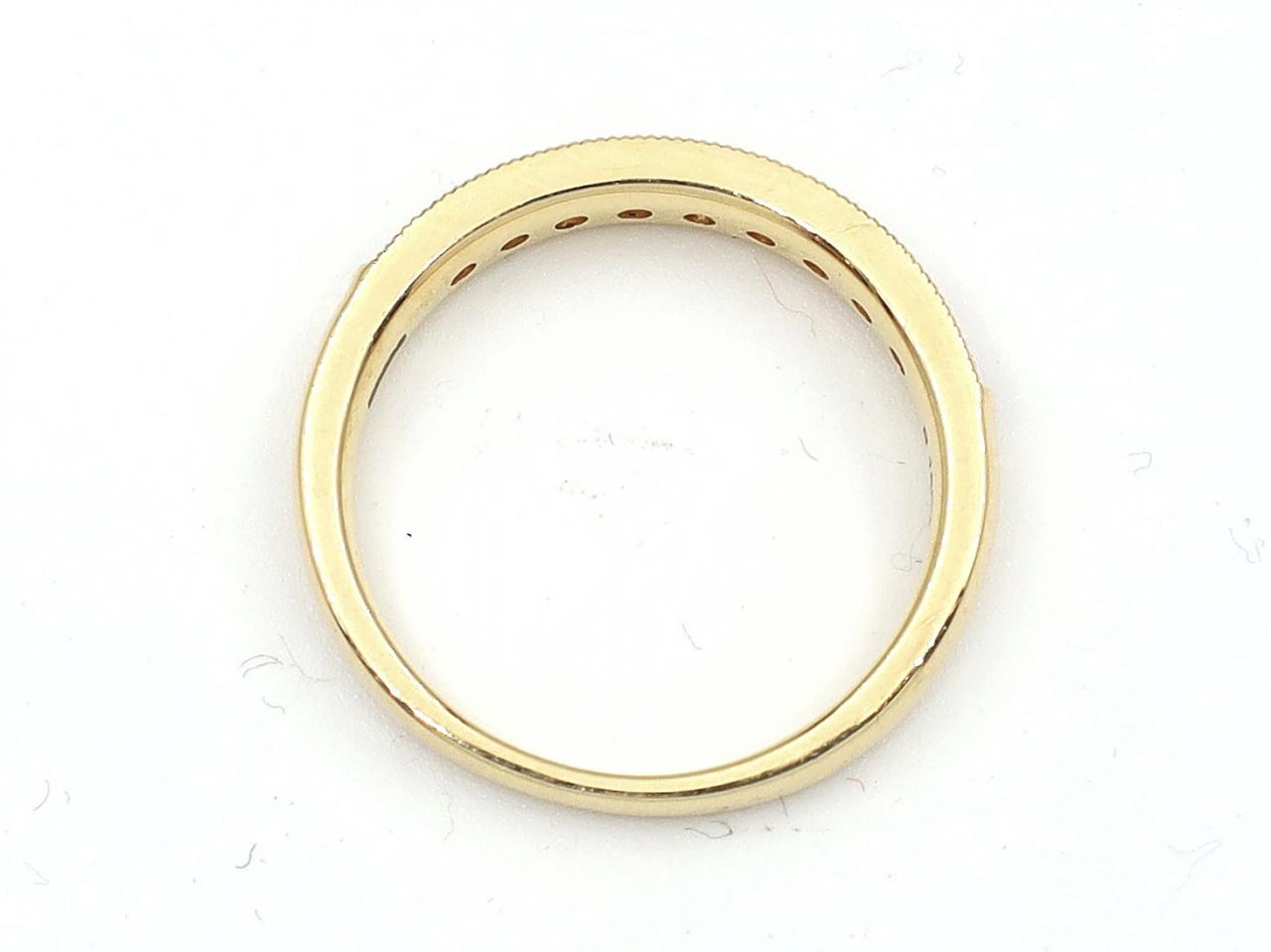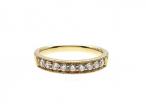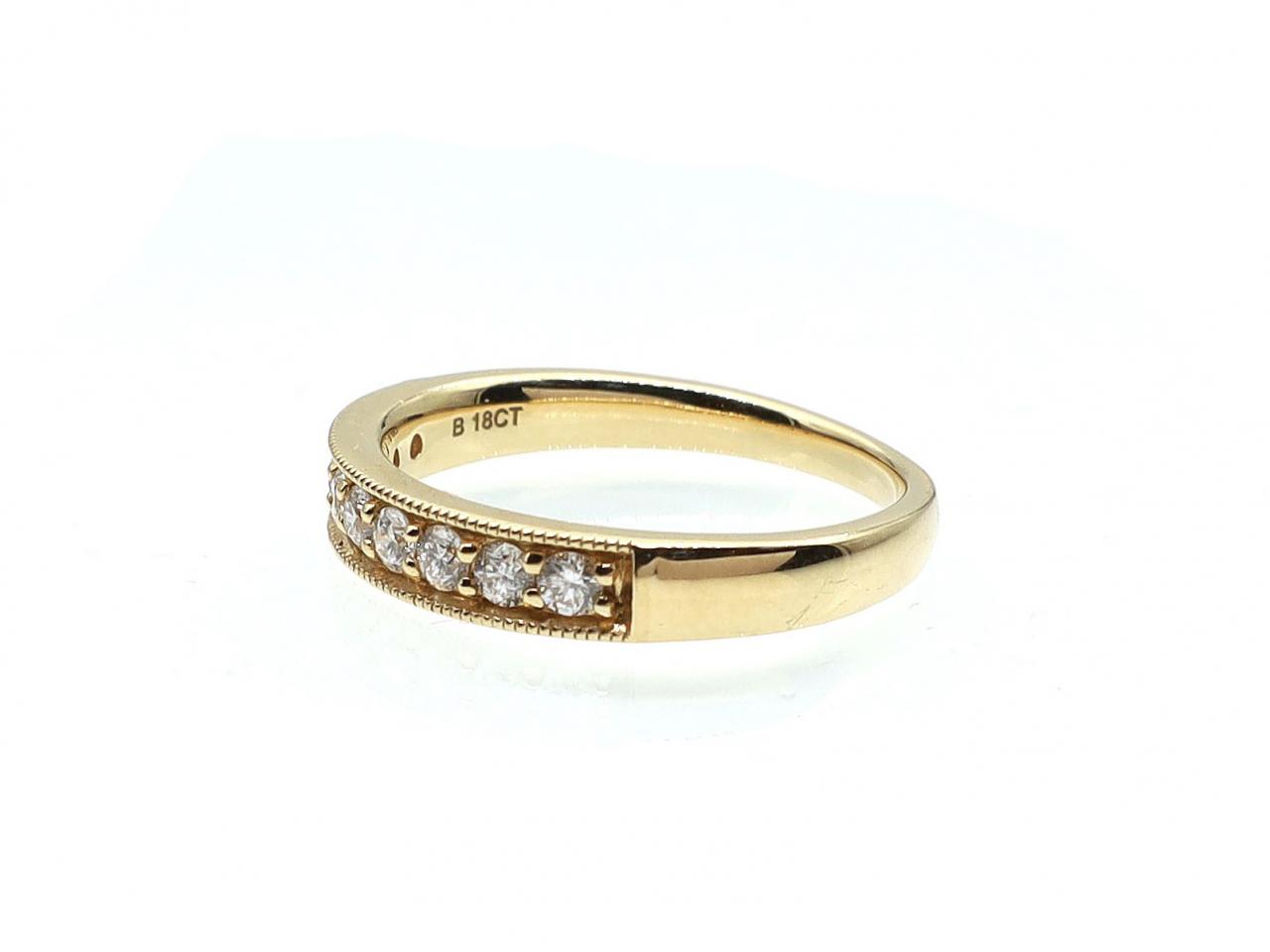 Diamond grain set half eternity ring in 18kt yellow gold. Set with round brilliant cut diamonds in grain settings, framed by millegrain decoration and terminating to a solid shank. Hallmarked 18kt gold.