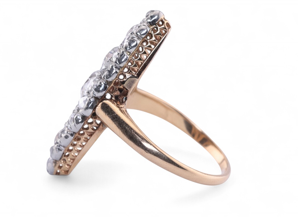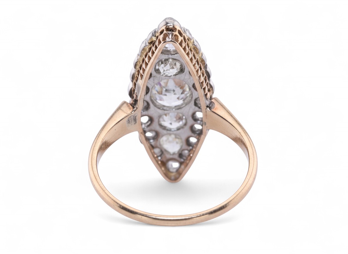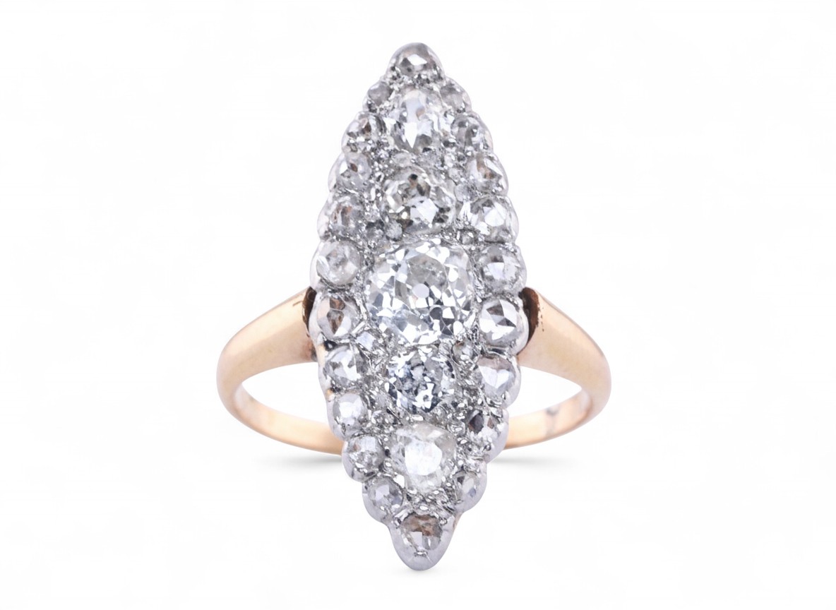 Antique-style marquise cluster ring set with old-cut diamonds of estimated total weight 1.10 carats. Central diamond approximately 0.45ct, surrounded by graduated old-cut stones in a silver-topped 14ct yellow gold mount. Diamonds estimated I colour, SI1 clarity. Finger size I.