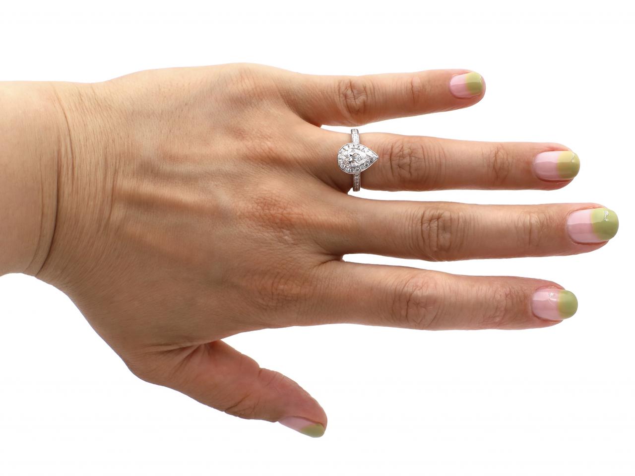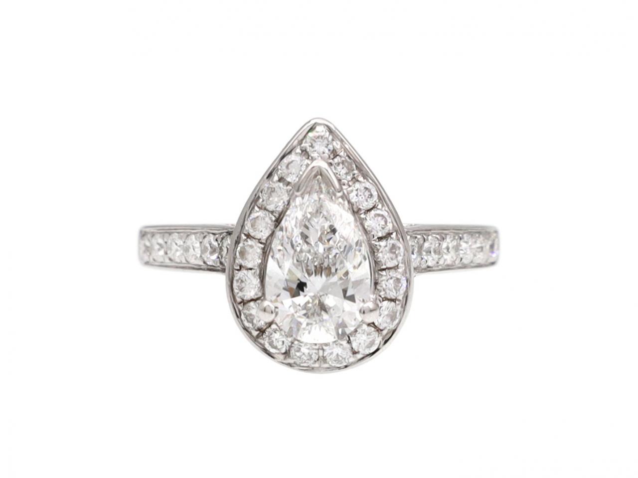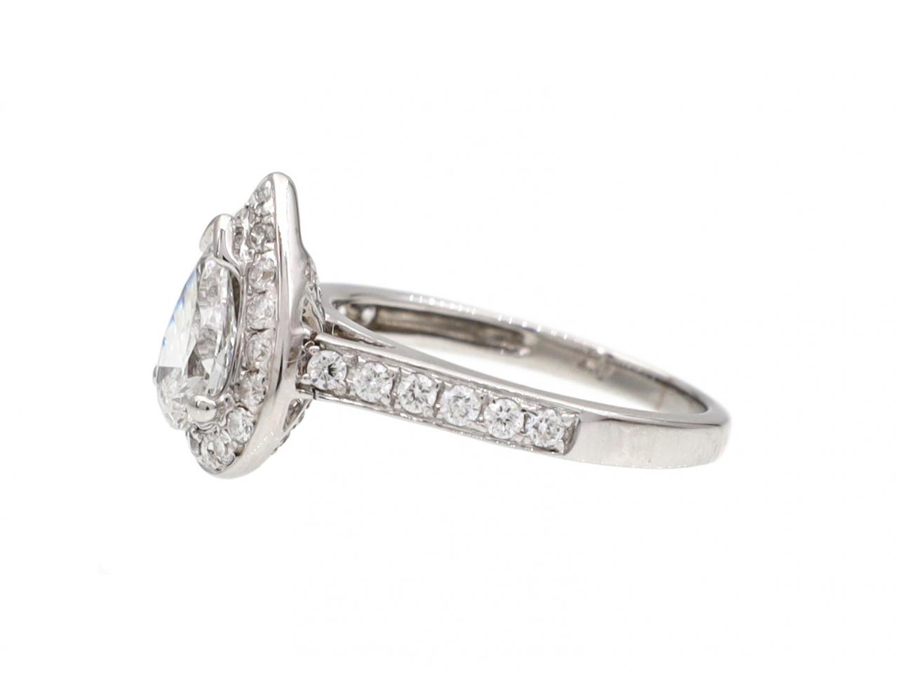 Diamond pear shape halo cluster engagement ring in 18kt white gold. Centrally set with an estimated 0.70ct pear shape brilliant cut diamond in a raised claw setting, bordered and flanked by round brilliant cut diamonds in pave settings, to an elegant pear shape cluster with curving claws, polished borders and openwork gallery with diamond details, met to either side with raised diamond set shoulders which terminate to a solid shank. Hallmarked 18kt gold.