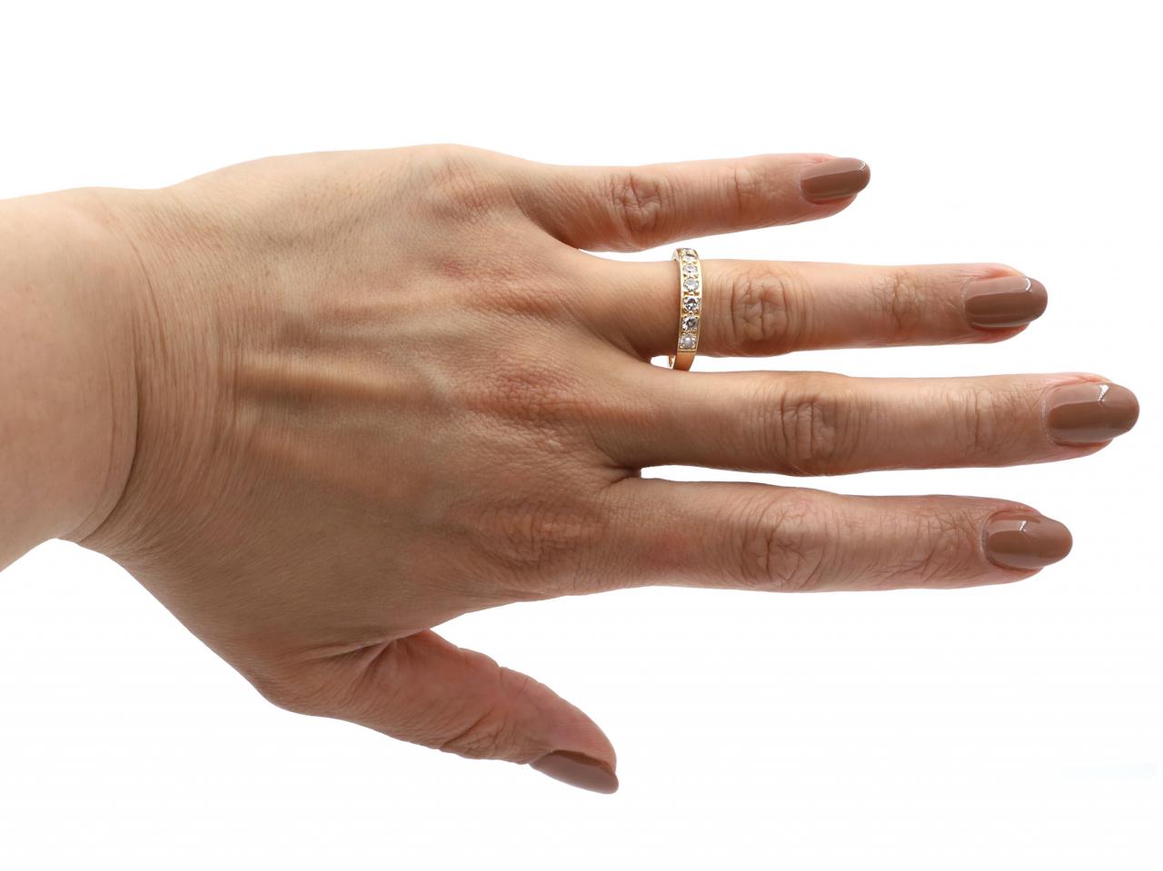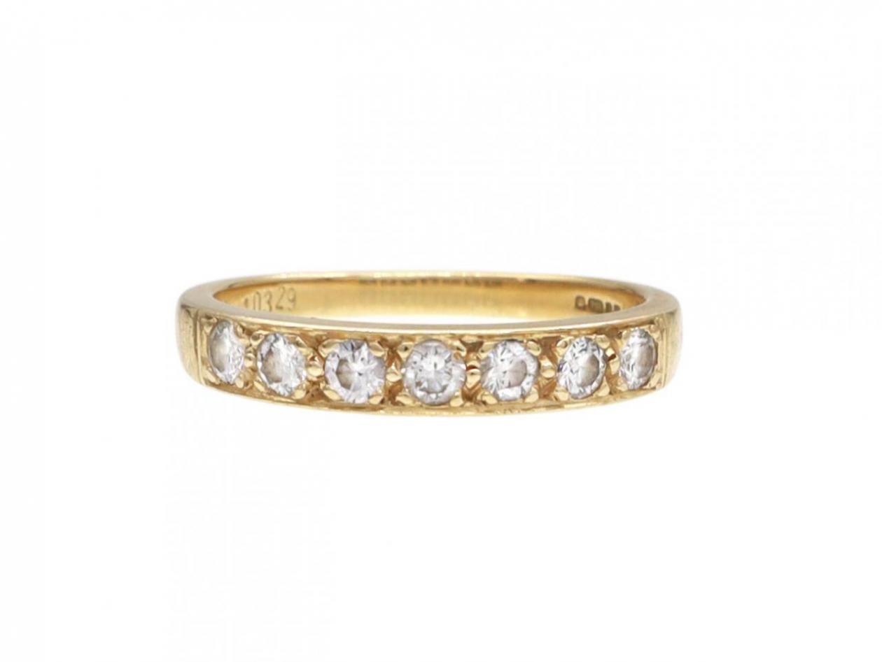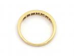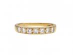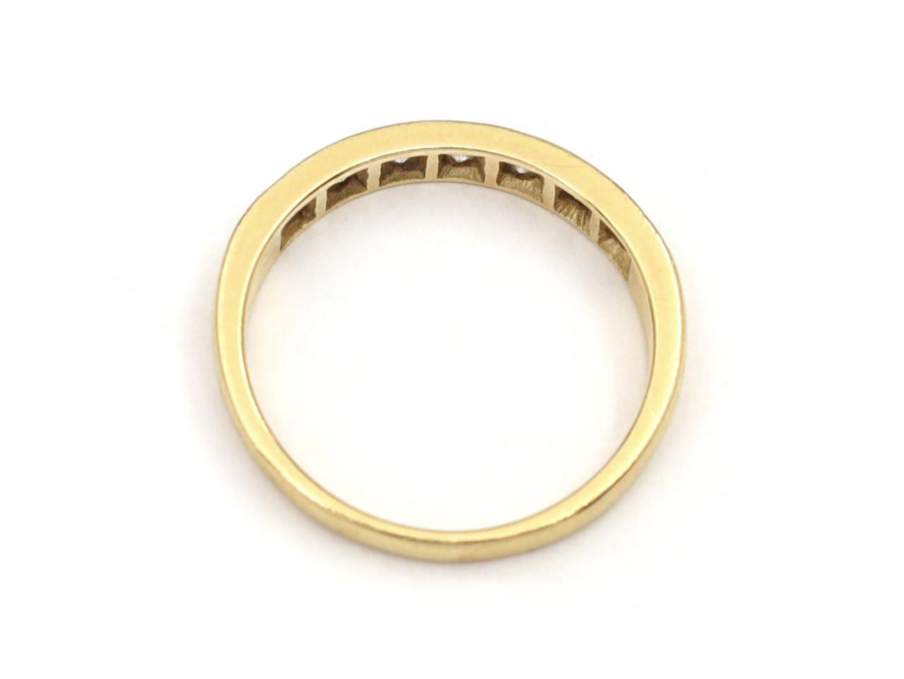 Diamond seven stone half eternity ring in 18kt yellow gold. Set with seven round brilliant cut diamonds in grain settings, flanked by smooth shoulders which continue to a solid shank. Hallmarked 18kt gold, London.