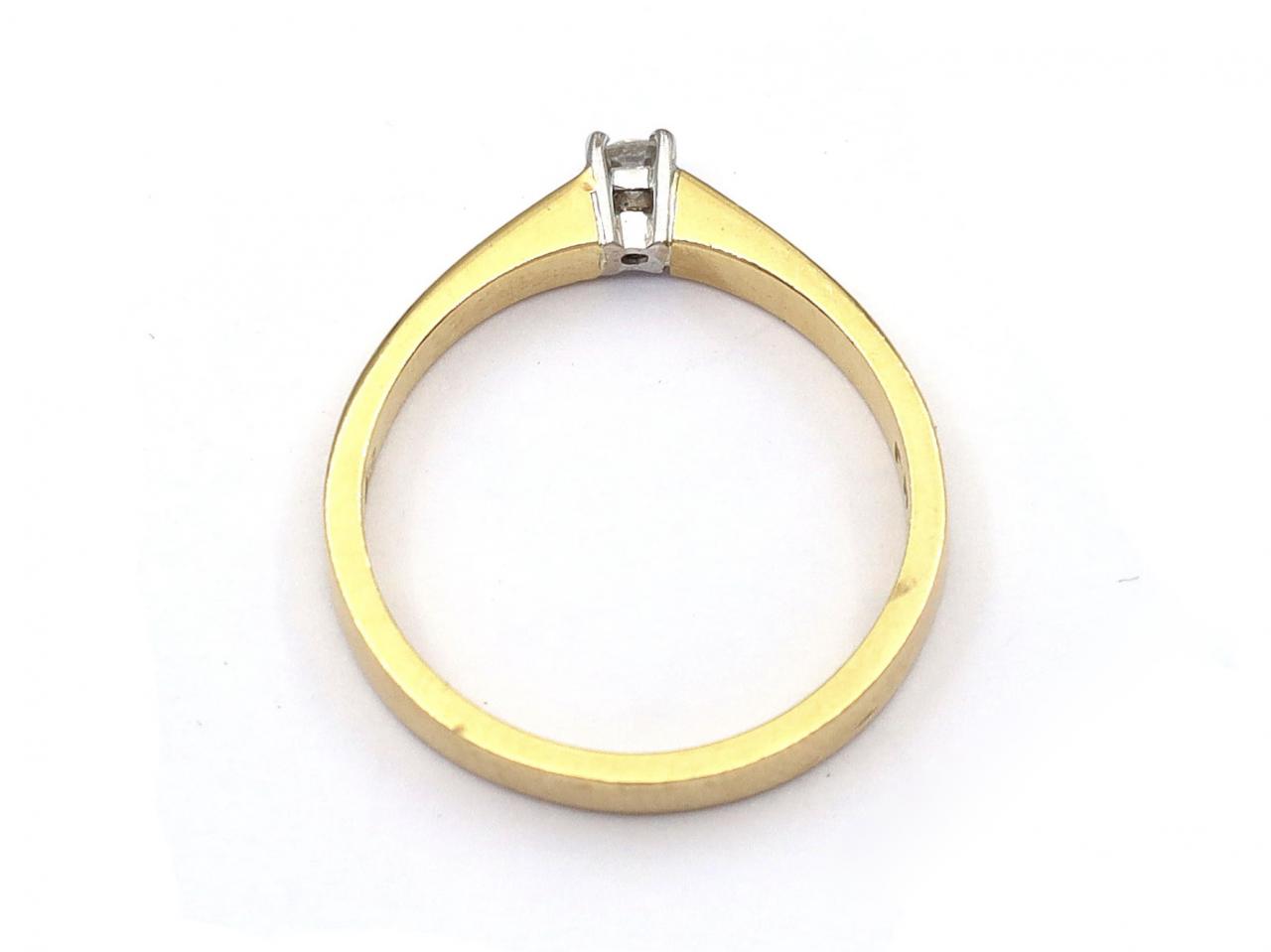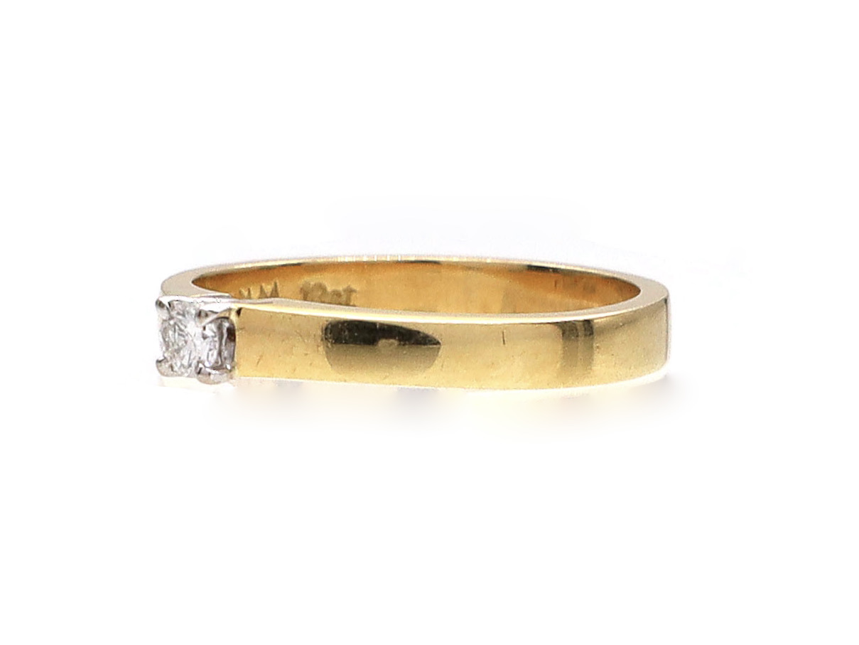 Diamond solitaire engagement ring in 18kt yellow gold. Centred with a 0.05ct round brilliant cut diamond in a raised four claw setting, flanked to either side with square raised shoulders which smooth to a solid shank. Hallmarked 18kt gold, London.