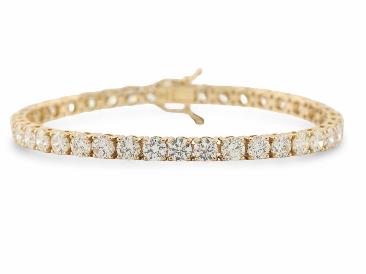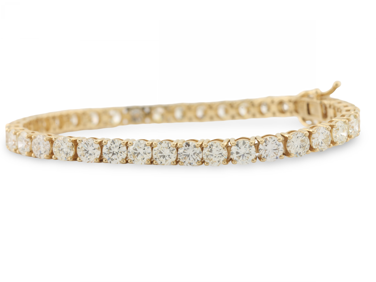 A substantial diamond tennis bracelet in 18ct yellow gold set with 12 carats of round brilliant cut diamonds. Each stone is held in an individual four-claw setting, creating an unbroken line of diamonds around the wrist. The diamonds are well-matched for size and colour, giving the bracelet a uniform, elegant appearance.