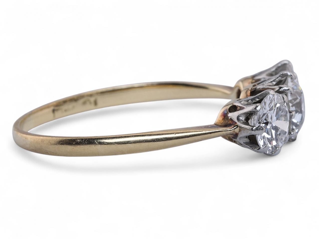 Three-stone diamond ring set with a round brilliant cut diamond to the centre weighing approximately 0.72ct, colour H/I, flanked by two round brilliant cut diamonds weighing 0.56ct and 0.59ct, colours F/G, clarity VS. Mounted in 18ct yellow gold. Finger size S.