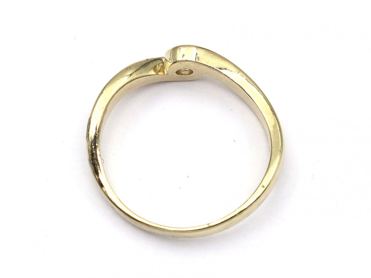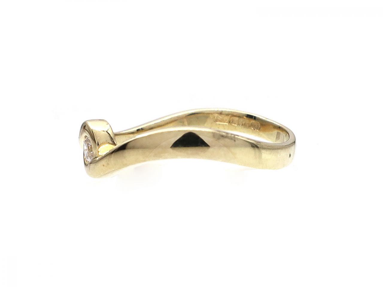 Diamond twist ring in 9kt yellow gold. Set with a round brilliant cut diamond in a rubover setting, flanked with swirling shoulders which flow to a solid shank. Hallmarked 9kt gold.