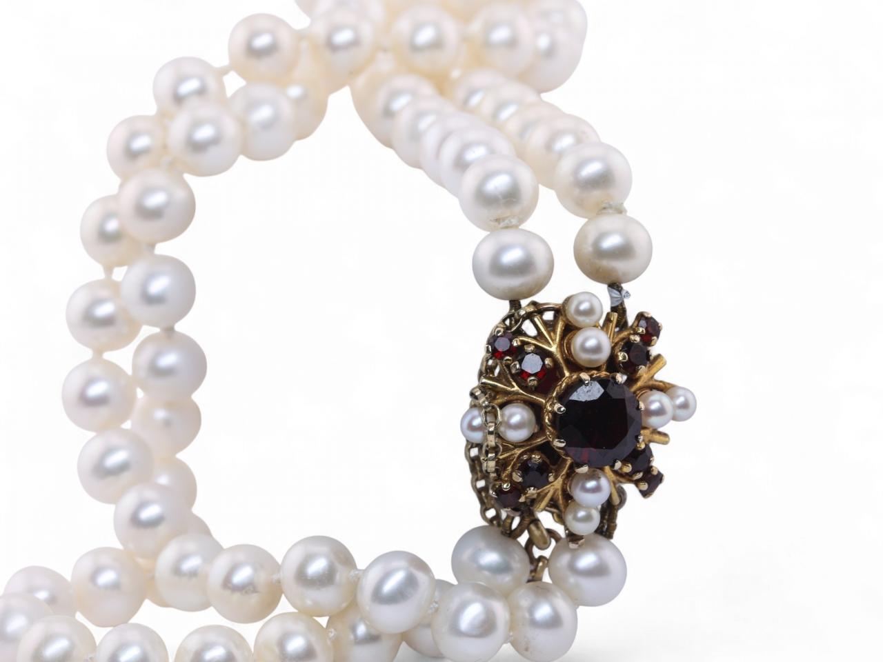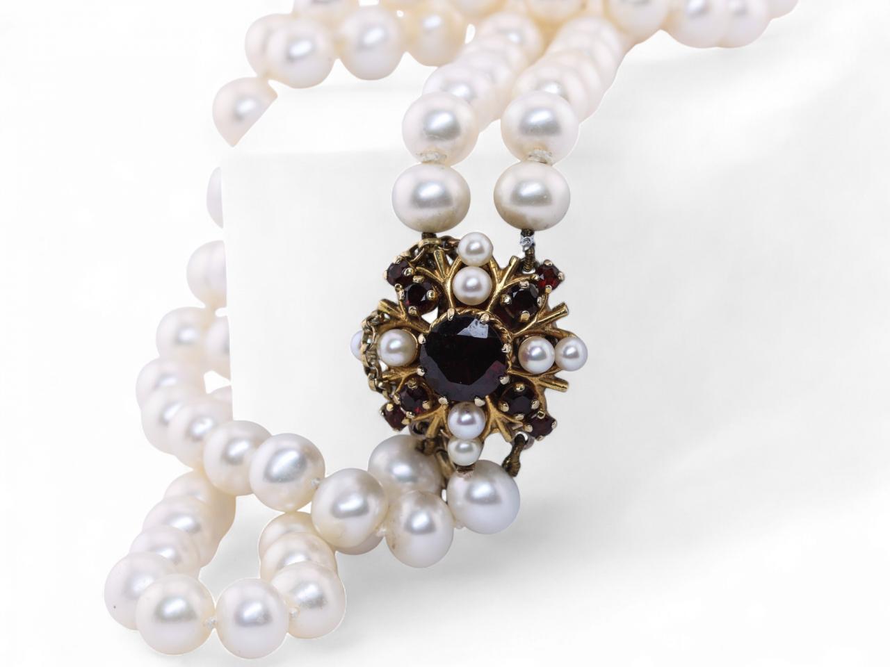 Elegant double strand of cultured pearls measuring approximately 7.5–7.7mm, featuring a striking 14ct gold clasp set with garnets and seed pearls in a sculptural design. The pearls exhibit fine lustre and consistent round shape. Clasp fitted with secure locking mechanism.