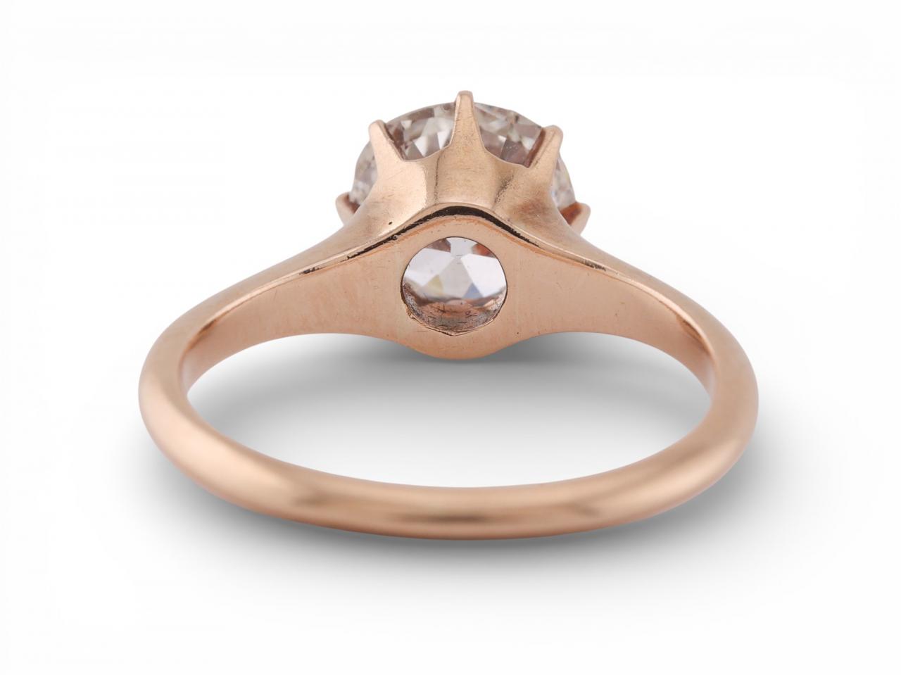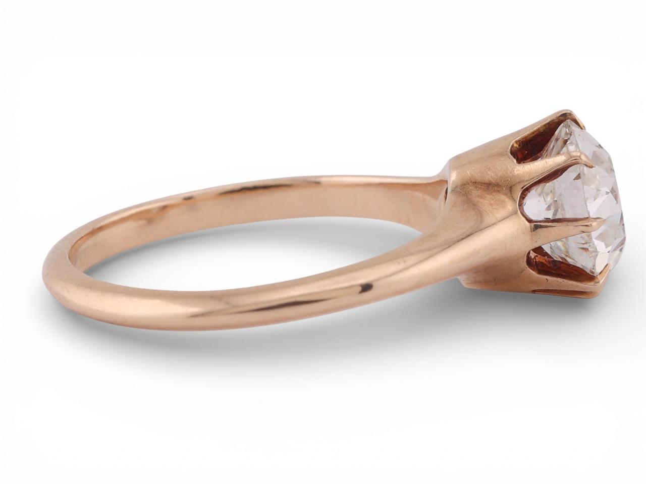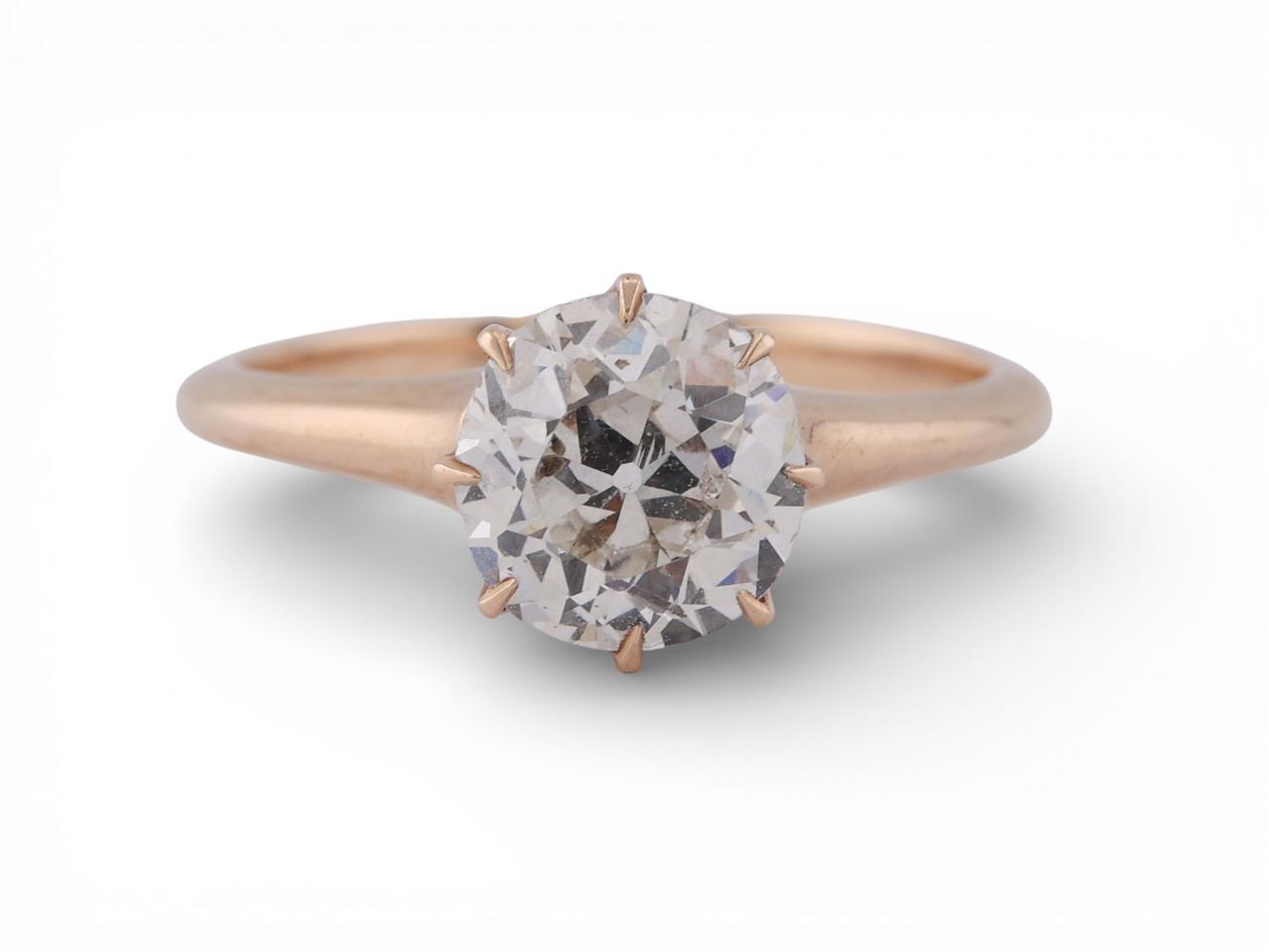 A very finely set diamond single-stone ring featuring a 1.50 ct Centre stone H/I colour. This lively old cut diamond is both elegant and solf on the hand with the rose tone of the finely made setting which flows over the finger and delivers a wonderful light return.