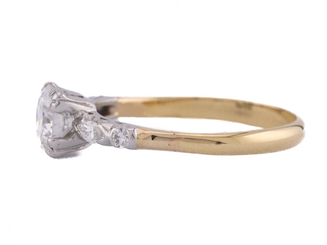 Early Art Deco Old European cut diamond solitaire engagement ring in 18kt yellow gold and platinum. Centred with an estimated 0.65ct Old European cut diamond in a square collet setting, flanked to either side with an old marquise and eight cut diamond in bespoke claw settings, to a solitaire design with structured settings, openwork gallery and met to either side with slim shoulders which curve to a slim shank.