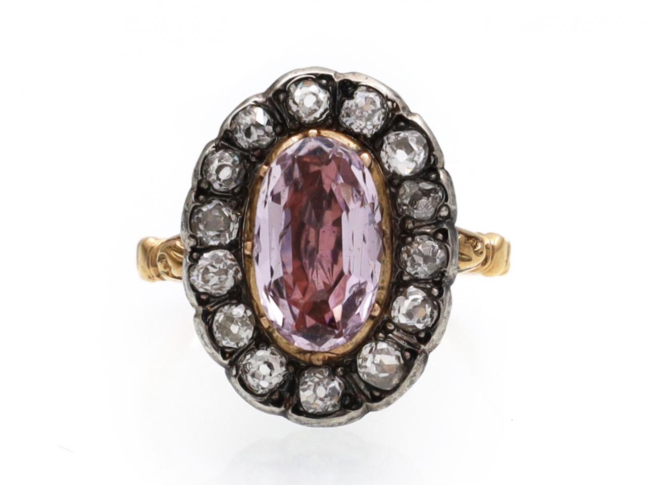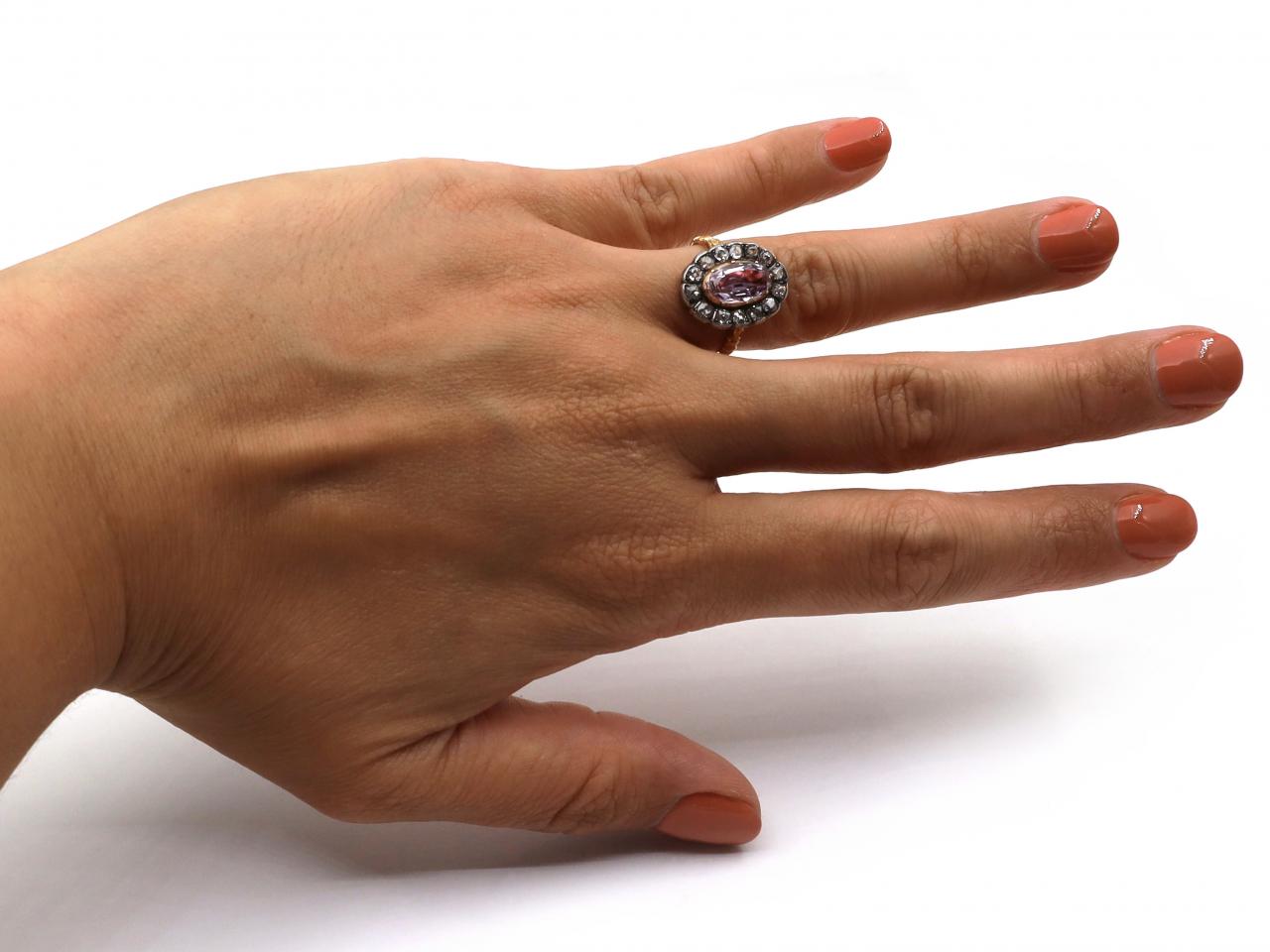 Early Victorian pink topaz and diamond oval cluster ring in silver and 18kt yellow gold. Set with a 1.95ct elongated oval mixed cut pink topaz in a yellow gold closed cutdown setting, framed by a row of cushion shape old cut diamonds in silver grain settings, to an elegant floral cluster design with fine settings and met to either side with slightly trumpeting shoulders with hand carved details terminating to a slim ribbed shank.