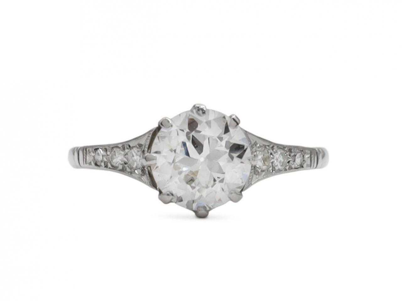 Edwardian 1.00ct diamond solitaire engagement ring in platinum. Centrally set with an estimated 1.00ct round Old European cut diamond in a claw setting, to a classic solitaire design featuring a slightly raised collet, curving claws and flanked to either side with trumpeting shoulders set with six old cut diamonds in grain settings, terminating to subtle ribbing before smoothing to a solid shank. Marked platinum.