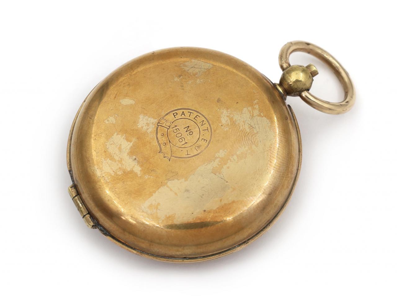 Edwardian compass and collapsible drinking cup travel aid in brass. A circular case, the front fitted to the centre with a working compass and to the top with a matte boule, circular bale and button press, opening to reveal a collapsible cup etched to the base with a Greek key motif and