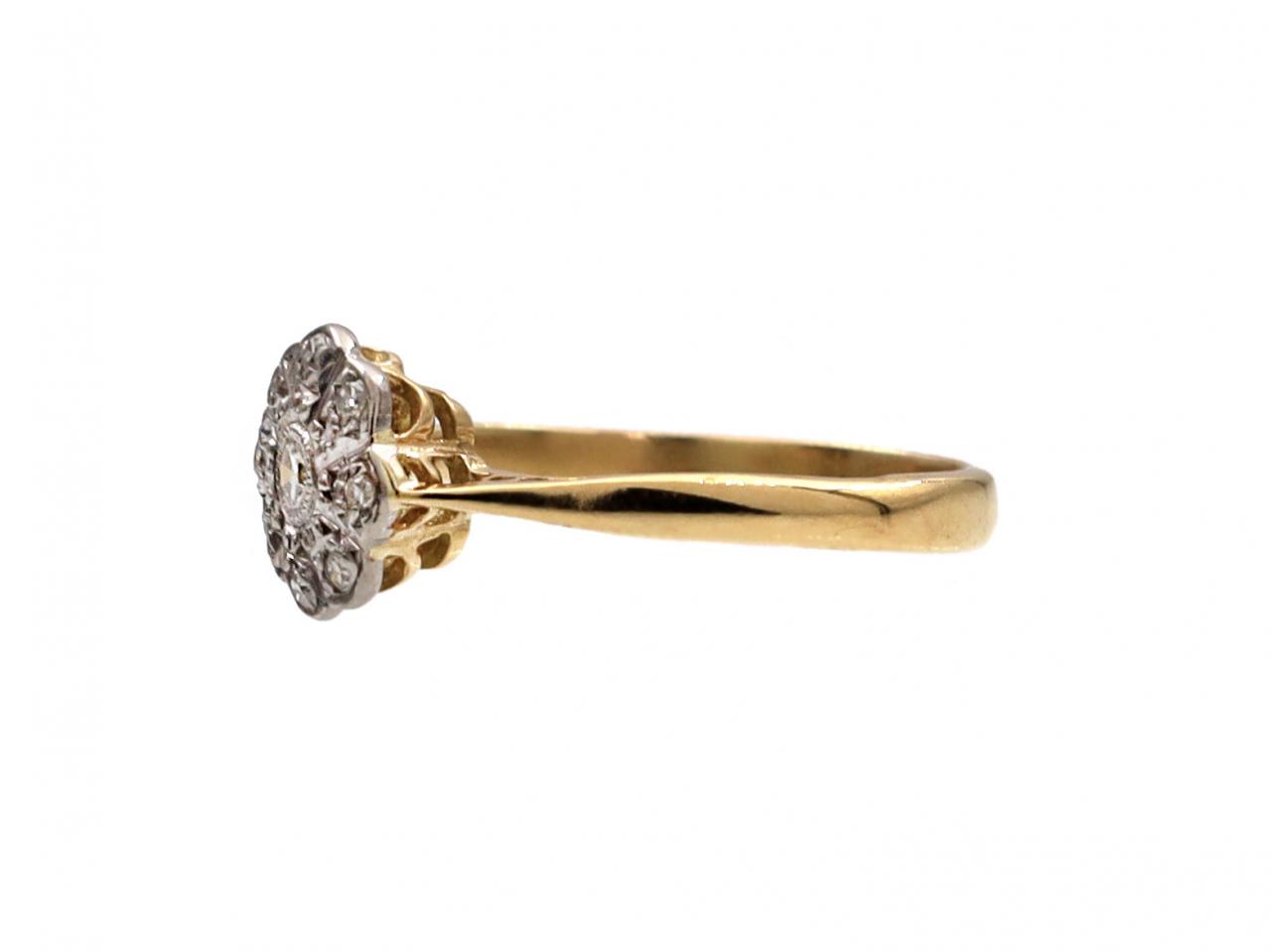 Edwardian diamond daisy cluster ring in platinum and 18kt yellow gold. Centred with a round eight cut diamond in a millegrain setting, surrounded by a row of round eight cut diamonds in platinum grain settings, to a floral cluster design will millegrain details, pierced scalloped openwork gallery and flanked by raise inwardly tapering shoulders supported by cheniers and curving to a solid shank. Hallmarked 18kt gold.