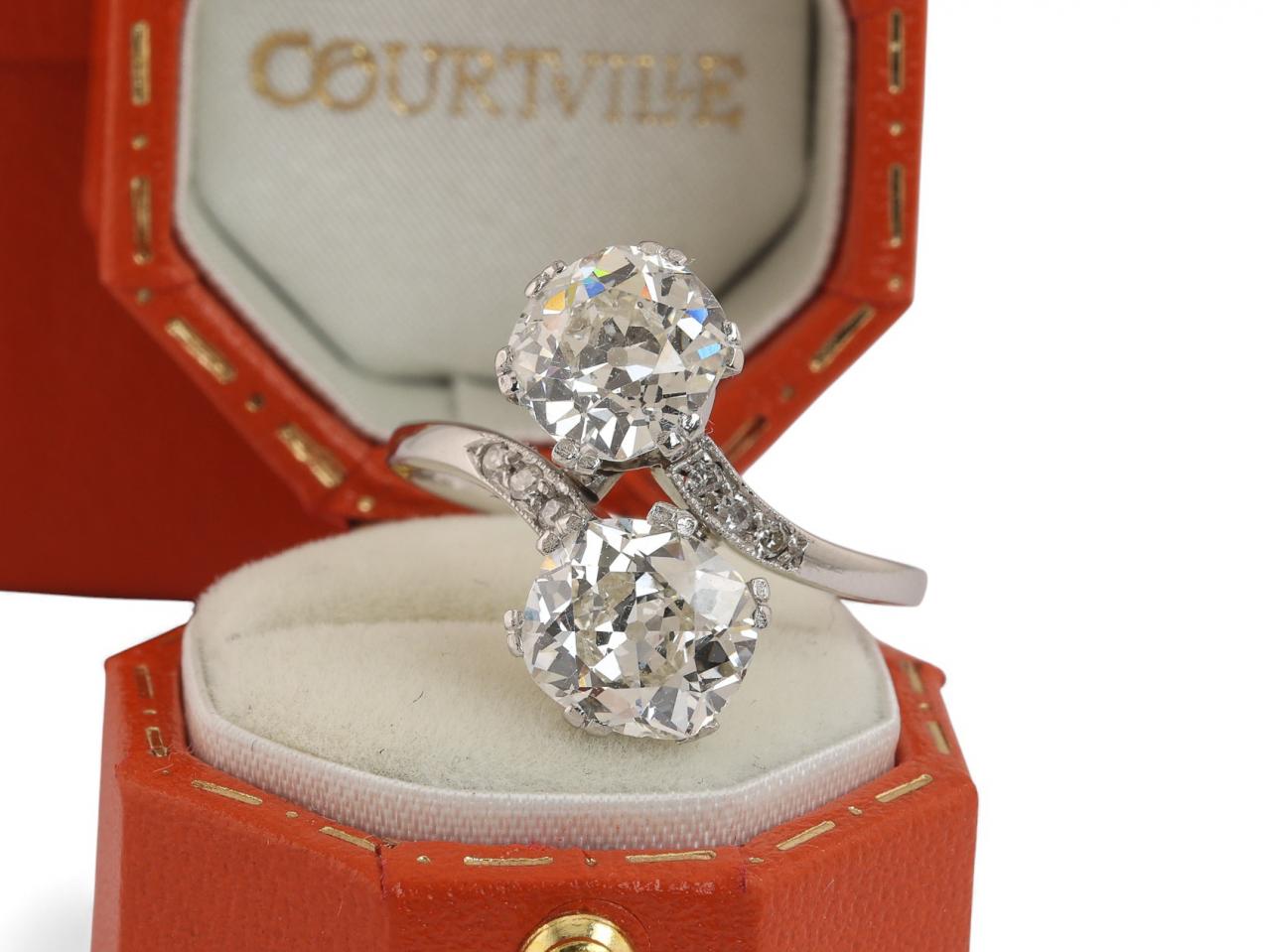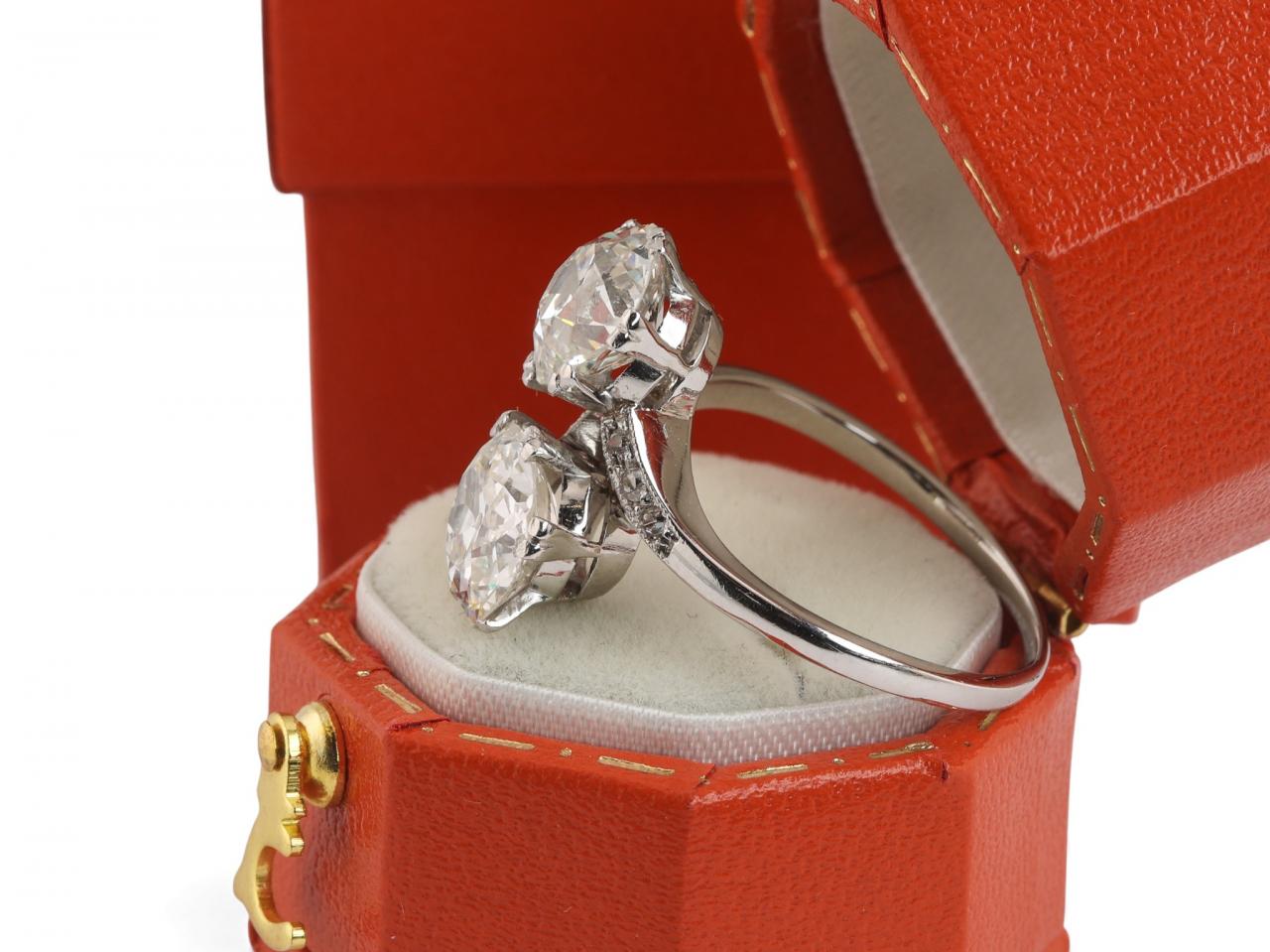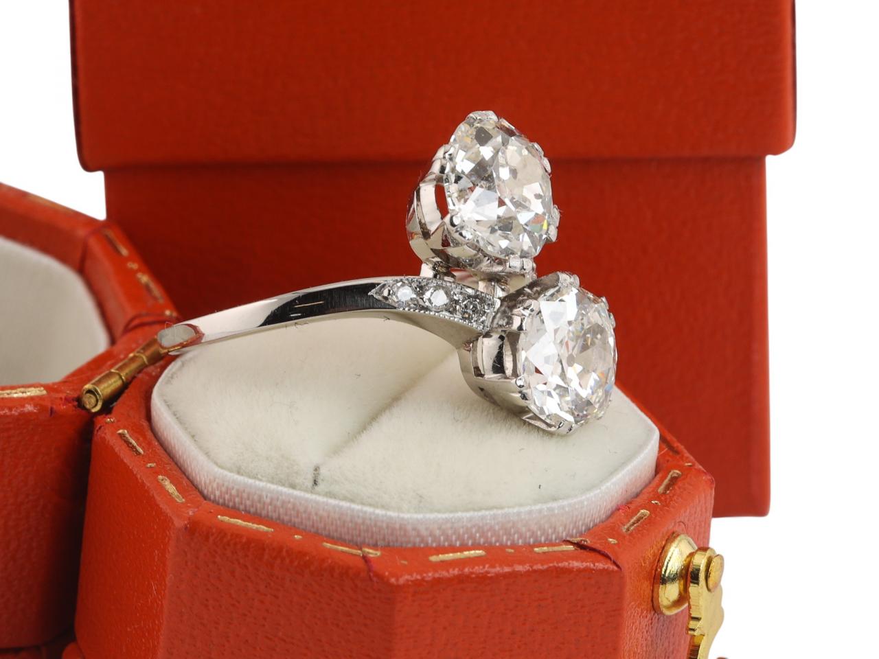 An elegant Edwardian toi et moi ring crafted in platinum and dating to the early 20th century. The ring is set with two old cut diamonds in a balanced twin-stone arrangement, symbolising unity and partnership. The diamonds have a combined estimated total weight of 3.20 carats and are assessed as SI1 clarity overall.