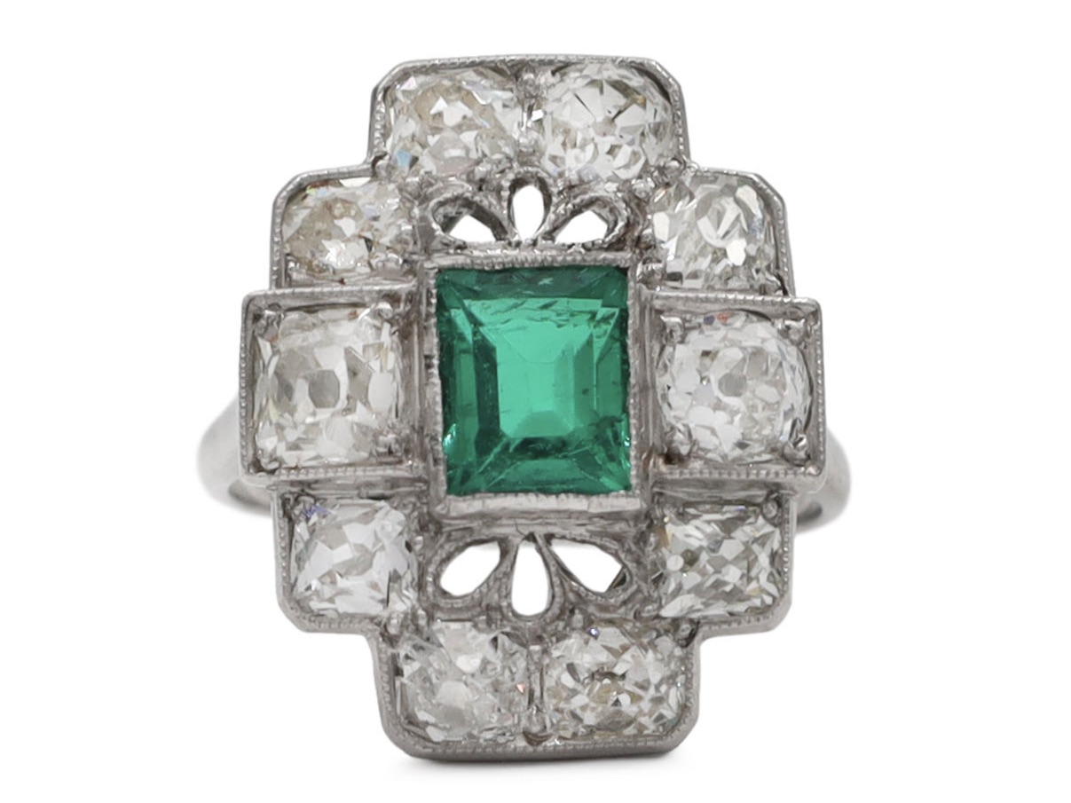 Art Deco emerald and diamond cluster ring in platinum. Centred with an estimated 0.76ct rectangular step cut emerald in a millegrain setting, surrounded with ten cushion shape Old Mine cut diamonds in square grain settings, to a fancy cluster design featuring openwork details, millegrain decoration and a pierced webbed gallery, met to either side with raised slightly trumpeting shoulders, supported by decorative cheniers and curving to a solid shank. Estimated total diamond weight 1.75cts.
